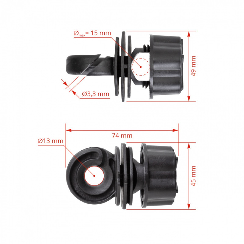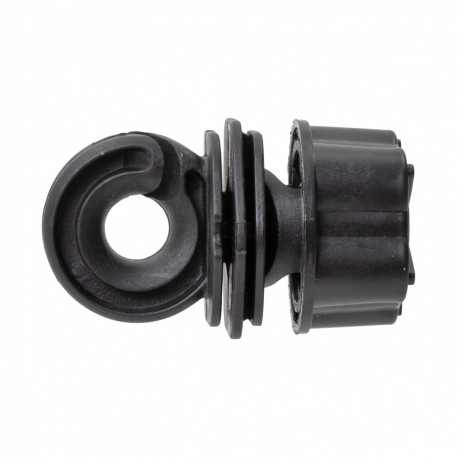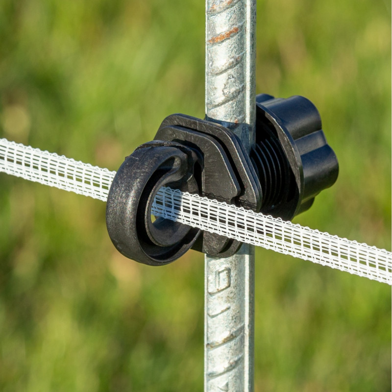 Izolatorul este potrivit pentru benzi inguste (10-12 mm) si pentru fir sau franghie. Este confectionat din plastic dur, rezistent la radiații UV. Datorita formei speciale, elimină stropii de apa cu usurinta, astfel previne pierderea energiei electrice a sistemului de gard electric in timp de ploaie.
