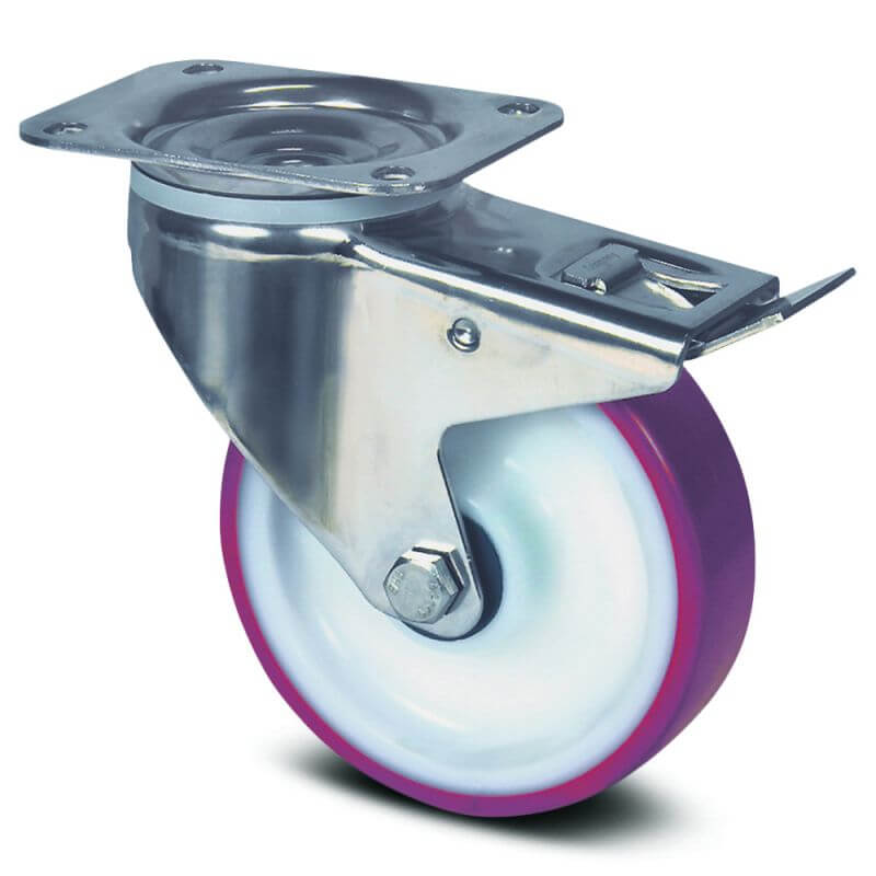 Rolă pivotantă cu frana, furcă din inox rând dublu de bile în capul pivotant, sistem de prindere tip placa ,axul rotii cu surb si piulita ,flansa antipraf.Jantă din poliamida, Suprafaţă de rulare: poliuretan , rulment cu colivie cu ace.