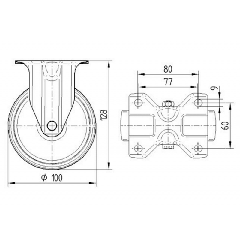 Rolă fixă, furcă din tablă din oţel, ambutisată, zincată, axul rotii cu surub si piulita, sistem de prindere tip placa.