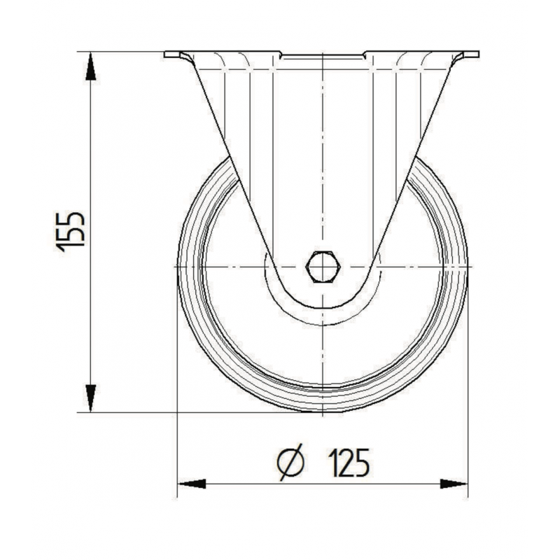 Rolă fixă, furcă din tablă din oţel, ambutisată, zincată, axul rotii cu surub si piulita, sistem de prindere tip placa.