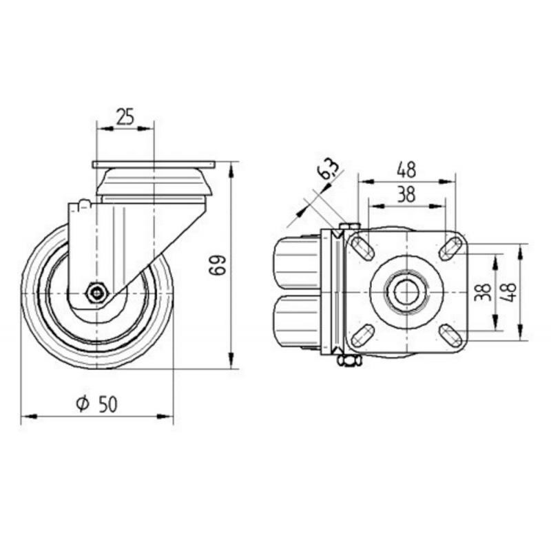 Rolă pivotantă, furcă din tablă din oţel, , rând dublu de bile în capul pivotant, .