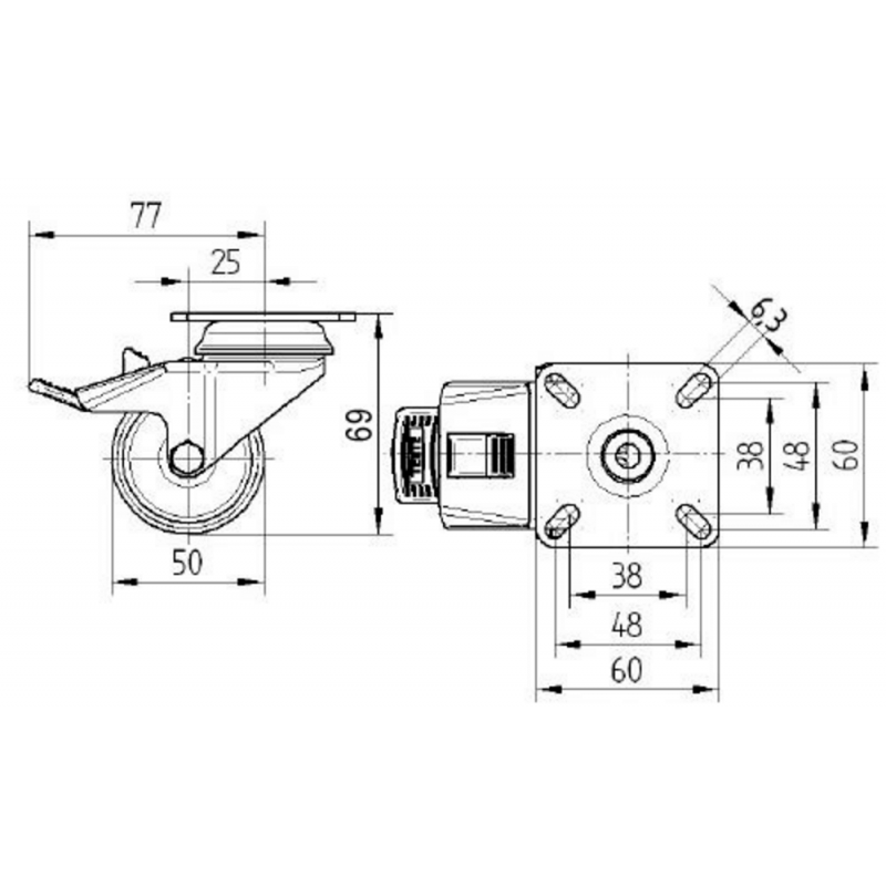 Rola pivotanta cu blocare pe roata, furcă din tablă din otel, ambutisata, zincata, rand dublu de bile in capul pivotant, sistem de prindere tip placa.
