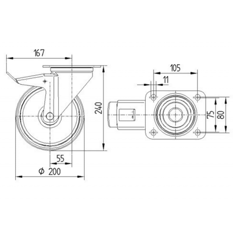 Roata pivotanta cu frana .Furca din tabla din otel, ambutisata, zincata, cap pivotant cu rulment pe două randuri de bile, axul rotii cu surub si piulita, flansa antipraf, sistem de prindere tip placa.Roata din poliamida, rulment cu role .