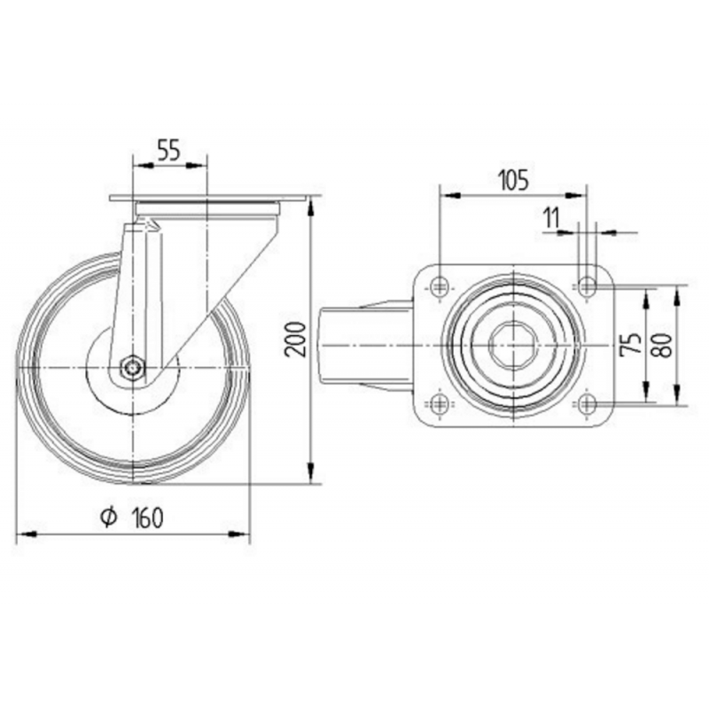Janta din polipropilenal. Suprafata de rulare din cauciuc plin negru, rulment cu role ace.