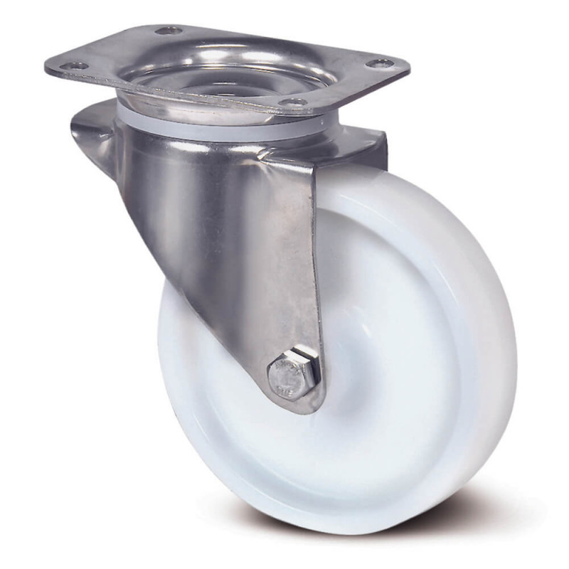 Furca din inox , cap pivotant cu rulment pe două randuri de bile, axul rotii cu surub si piulita, flansa antipraf, sistem de prindere tip placa.