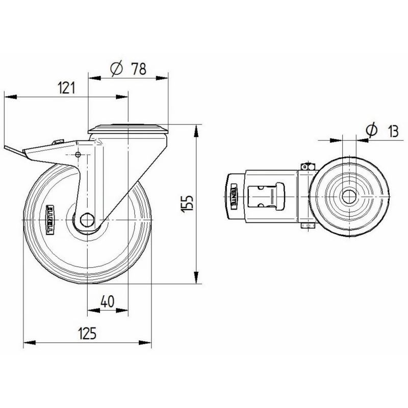 Rolă pivotantă cu frana, furcă din tablă din oţel, ambutisată, zincată, rând dublu de bile în capul pivotant,ax cu surub , alezaj pentru ax ,
