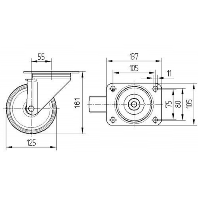 Jantă din polipropilena. Suprafaţă de rulare din cauciuc plin negru, rulment cu role ace.