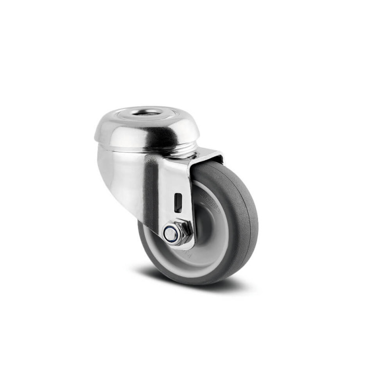 Rolă pivotantă, furcă din otel inoxidabil , rând dublu de bile în capul pivotant, alezaj pentru ax.