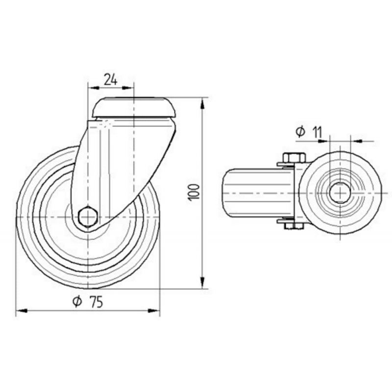 din polipropilenă, suprafata de rulare din cauciuc termoplastic ,rulment plan (bucşă antifricţiune).