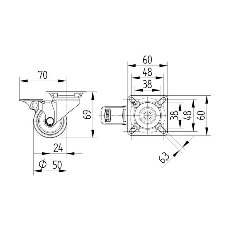 Role pivotante cu blocare pe roată, furcă din tablă din oţel inoxidabil, rând dublu de bile în capul pivotant, ax nituit, alezaj pentru ax.