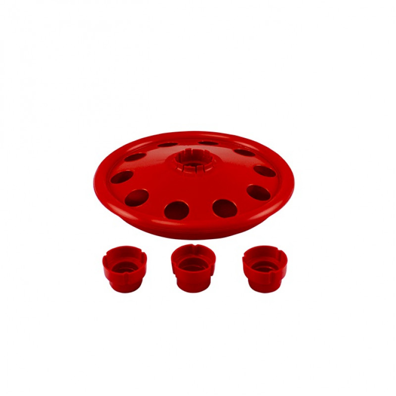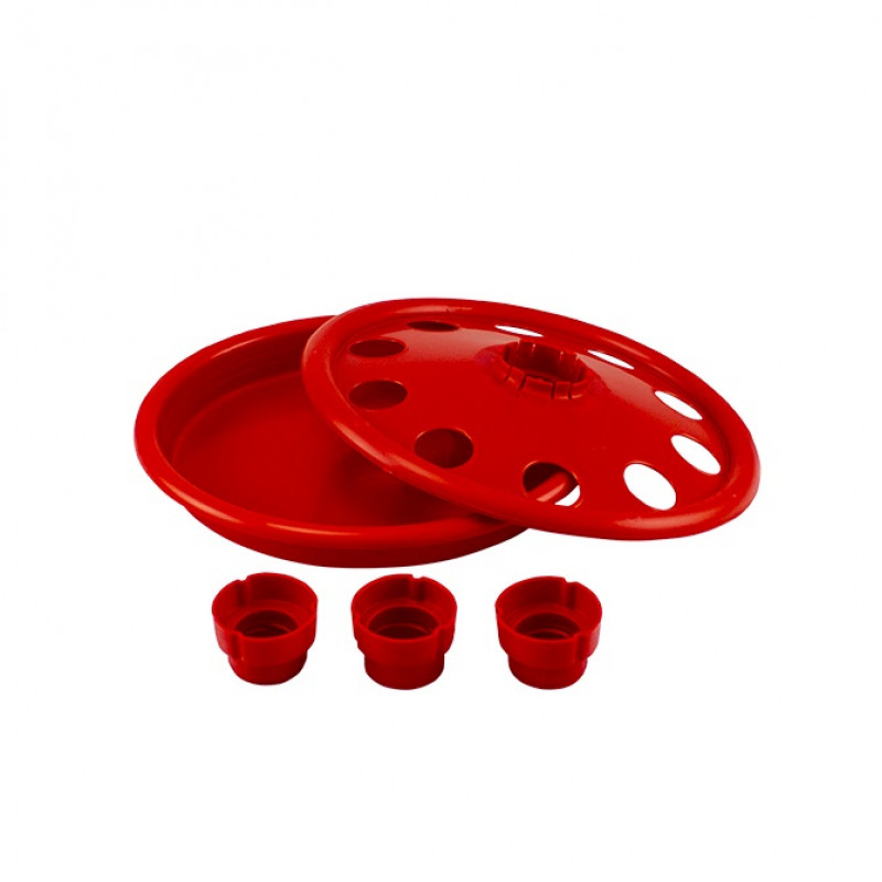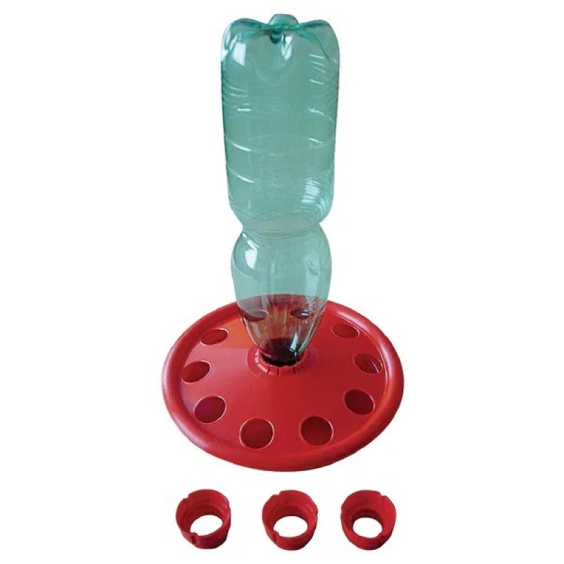 Canalul de baut este compus din două parti separate, care sunt unite intre ele prin blocare. In discul superior exista o gaura centrala pe care se fixează sticla . Suportul pentru sticle pentru pui vine cu 3 adaptoare , fiecare cu diametru si filet diferite, potrivite pentru diferite tipuri de sticle de plastic. Dimensiunile celor 10 gauri din care beau puii sunt astfel incat sa le permita sa bea fara a se uda sau a cadea in jgheab. In plus, marginile sunt rotunjite si finisate pentru a evita ca animalele sa nu se raneasca singure . Sticla poate fi umplută scotand-o din adapatoare impreuna cu insertia sau desuruband-o.