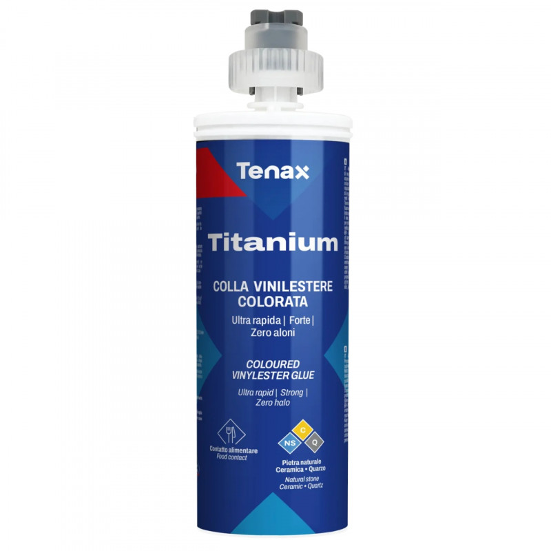 Tenax Titanium Cartridge este un chit epoxidic vinil ester acrilat ultrarapid, formulat pentru a lipi marmură, granit, aglomerat de marmură, cuarț și ceramică. Oferă o aderență excelentă într-un timp foarte scurt, permițând prelucrarea rapidă a pieselor lipite chiar și la temperaturi scăzute. Acest produs combină practicitatea, rezistența și rapiditatea pentru lipirea multimaterialelor la 45°, este disponibil într-o gamă largă de culori și oferă potrivire de culoare cu principalele mărci de cuarț și ceramică. Produsul întărit are o suprafață foarte netedă, lucioasă și bine lustruită.
