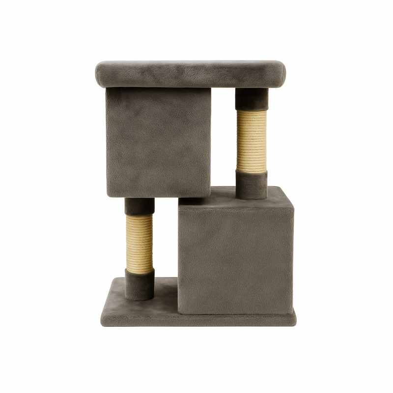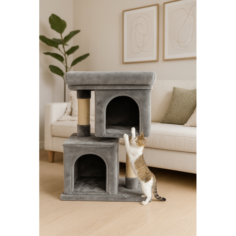 Scurta descriere Ansamblu de zgariat tip turn cu doua niveluri, casuta, pat si tunel, ideal pentru joaca, odihna, zgariat si observarea mediului, oferind pisicii un spatiu confortabil si sigur.