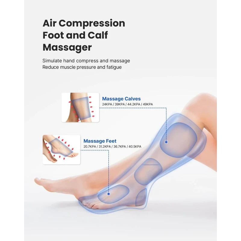| Principiul de bază al masajului | Presiunea variabilă exercitată asupra mușchilor picioarelor prin alimentarea cu aer și evacuarea acestuia simulează un masaj manual, însoțit de încălzire și compresie cu aer, pentru a stimula circulația sanguină și a reduce acumularea de acid lactic. |