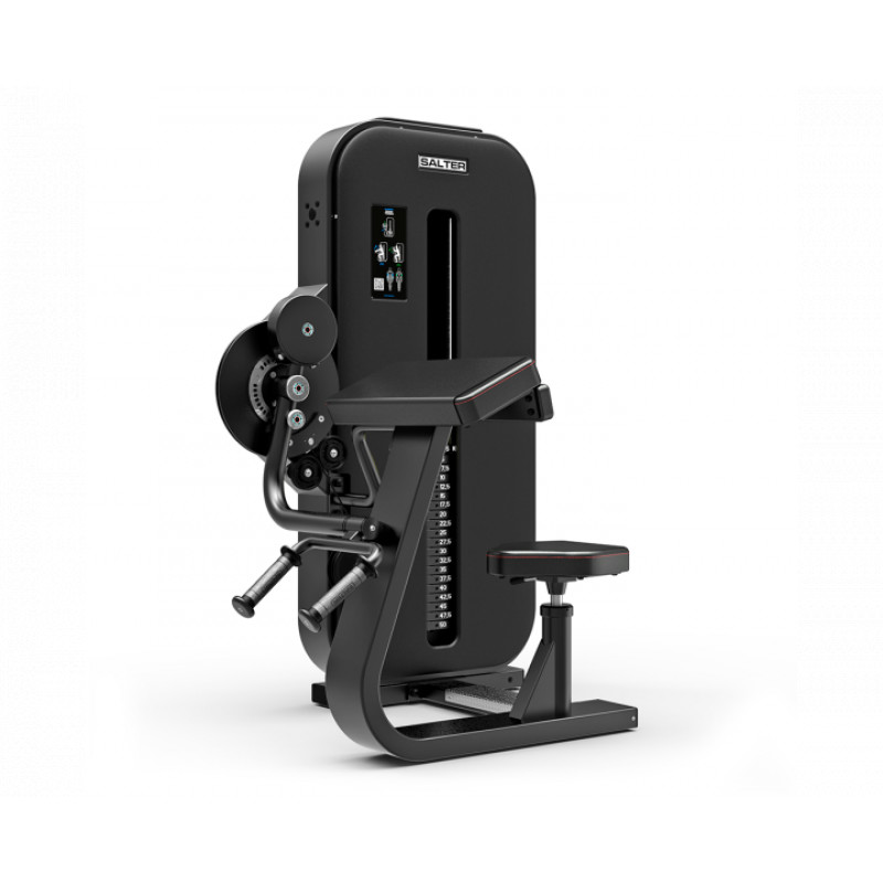 SPECIFICATII TEHNICE- Cadrul din oțel armat de 3 mm.@- Tratament antirugină și protecție specială la punctele de sudură.@- Acoperire cu pulbere de poliester la 200º în negru mat.@- Polițe de transmisie FIBABS, cu rulmenți cu bile, realizate din material compozit foarte rezistent la frecare și adaptate la diametrul cablului.@- Cablu de transmisie cu grosimea de 6 mm, extrem de flexibil și rezistent. Include tensor pentru reglarea tensiunii.@- Protecție de încărcare termoformată față și spate, termoformată neagră capace de protecție a sarcinii.@- Opțional: personalizarea capacelor.- Tavă dublă suport obiecte în partea superioară.@- Scaunul și spătarul sunt nedeformabile sub presiune, realizate din poliuretan injectat (spumă).@- Tapițerie antibacteriană MRSA, SANITIZATĂ, ignifugă Standard M2, UNE 1021 și fără solvenți și substanțe nocive Standarde OEKO-TEX. Cusături de culoare roșie intensă.@- Capac de protecție interschimbabil pentru tapițeria cotierei.@- Mânere de reglare realizate din aluminiu anodizat pentru a preveni rugina.- Mânere injectate cu material cauciucat antiderapant, neporos.@- Scaun anatomic reglabil prin piston cu gaz.@- Goniometru din oțel inoxidabil pentru reglarea poziției de pornire poziție/unghi pentru exercițiile de biceps sau triceps.- Ghidaje pentru plăci din oțel inoxidabil.@- Plăci de 2,5 kg cu bucșe cu frecare redusă.@- Selector de sarcină cu sistem de siguranță magnetic și clemă pentru cablu.@- Sarcina de lucru: 50 kg.@- Pictogramă de descriere a exercițiului.@- Cod QR cu acces la video de utilizare a aparatului.@- Dimensiuni: 124 x 101 x 157 cm.@- Declarație de conformitate CE.@- Utilizare comercială.