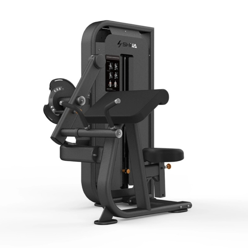 Prezentare generalăAparatul Dual Biceps/Triceps este parte din seria 68 Selectorized de la SHUA, conceput pentru antrenamentul dedicat al bicepsului și tricepsului, ideal pentru săli de fitness comerciale, studiouri și utilizare semi-profesională. Oferă o mișcare fluidă și controlată, combinând confortul ergonomic cu un mecanism robust.@Specificații tehniceModel: SH‑G6822ADimensiuni (L×l×Î): 1385 × 1020 × 1545 mm.Greutate netă:@ 190 kg@Greutate brută: 235 kg.Stivă de greutăți: 60 kg (12 plăci × 5 kg), ajustabil între 5 – 60 kg.Cadru: oțel Q235A — cadru portal 150 × 50 × 2 mm, sub-cadru 120 × 50 × 2 mm.Cabluri: oțel PA din Japonia, Ø 5,6 mm.Rulmenți / role: role nylon întărite, rulmenți liniari pentru o mișcare netedă și silențioasă.Tapițerie: spumă PU, scaun @ susținere bicep/preacher cu tapițerie verde închis.Culoare: negru argintiu sau “flash silver black ash”.Funcționalitate și mușchi vizațiFuncție duală: permite atât preacher curl pentru biceps, cât și press pentru triceps, schimbând poziția mânerelor și a brațelor.@Mușchi antrenați: biceps brahial, triceps brahial și mușchii antebrațului.Mișcare controlată: design ergonomic care aliniează mecanica aparatului cu traiectoria naturală de contracție musculară, protejând articulațiile.@Construcție @ durabilitateTestat pentru durabilitate: cadre și mecanisme testate pentru peste 900.000 de cicluri de utilizare.Materiale premium: conductor PA japonez, spumă PU, cadru robust ce asigură stabilitate și fiabilitate.Rulmenți de calitate: sistem de role și rulmenți care minimizează frecarea și zgomotul, oferind un exercițiu lin.@Confort @ siguranțăScaun ergonomic 2‑piesă: spate şi pad biceps preacher asigură postură corectă, reduc presiunea pe coloană și articulații.Mânere cromate: prindere sigură și ergonomică, suprafață anti-alunecare.Ajustare facilă: selector magnetic la îndemână, direct din poziția de lucru.Garanție @ suportCalitate garantată: construit după standarde stricte și testat în condiții de rezistență industrială.Garantie: 7 aniAvantaje @ recomandăriAvantaje principale:Funcție duală într-un singur aparat – eficiență în spațiu.Mișcare controlată, ergonomic concepută, ideală pentru izolare musculare precise.Construcție durabilă și stabilă, perfectă pentru uz zilnic intens.Potrivit pentru:Săli de sport comerciale, studiouri de personal training și entuziaști de home-gym care vor profesionalism.Utilizatori care doresc să favorizeze dezvoltarea bicepsului și tricepsului fără a folosi haltere.