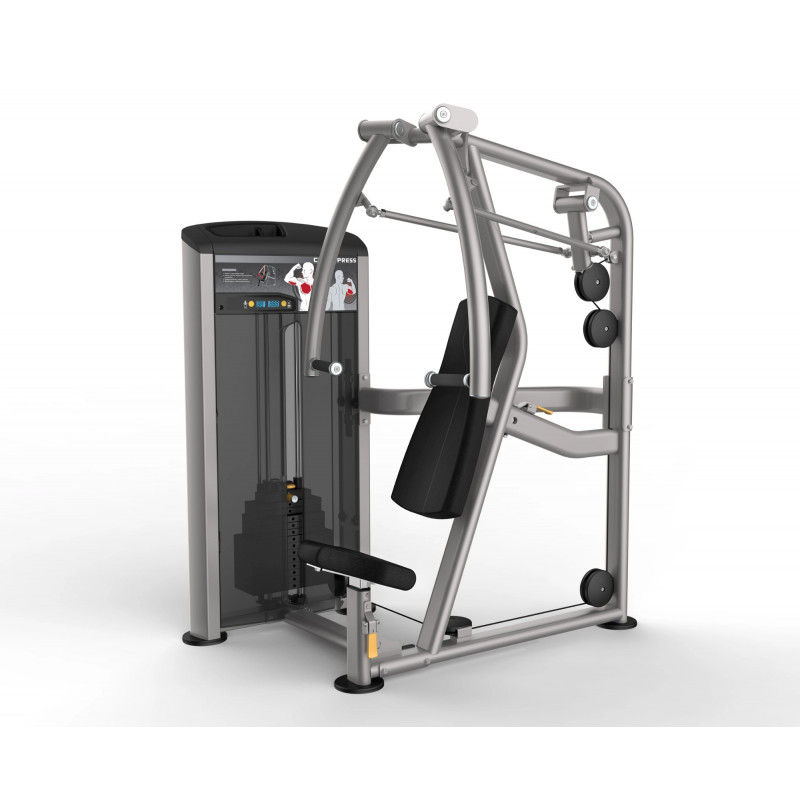 Presa piept, cu tapiterie rezistenta la rupere sau zgarieturi, cadru din otel rezistent la tensiune, cabluri de otel cu invelis de nylon. Mai intai setati inaltimea scaunului. Cand va asezati si apucati manerele, mainile ar trebui sa fie la aceeasi linie cu pieptul, nu mai sus sau mai jos. Daca pozitia nu este buna, continuati sa ajustati inaltimea scaunului pana ajungeti la varianta ideala. Picioarele trebuie sa stea relaxate pe sol, fara a pune presiune pe ele. Setati apoi incarcatura. Cel mai recomandat este sa se inceapa gradual, de la greutate mai mica la greutate mai mare, mai solicitanta. Incarcatura ideala este cea care oboseste muschii antrenati in 8-15 repetari. Spatele trebuie sa fie drept, fixat pe spatar, iar abdomenul contractat. Pentru muschi puternici, efectuati 8-12 repetari, a cate 1-3 serii. Dimensiuni: 149,7 x 137,3 x 183,1 cm Greutate produs: 150,1 kg Greutati incluse: 91 kg Producator: IMPULSE FITNESS
