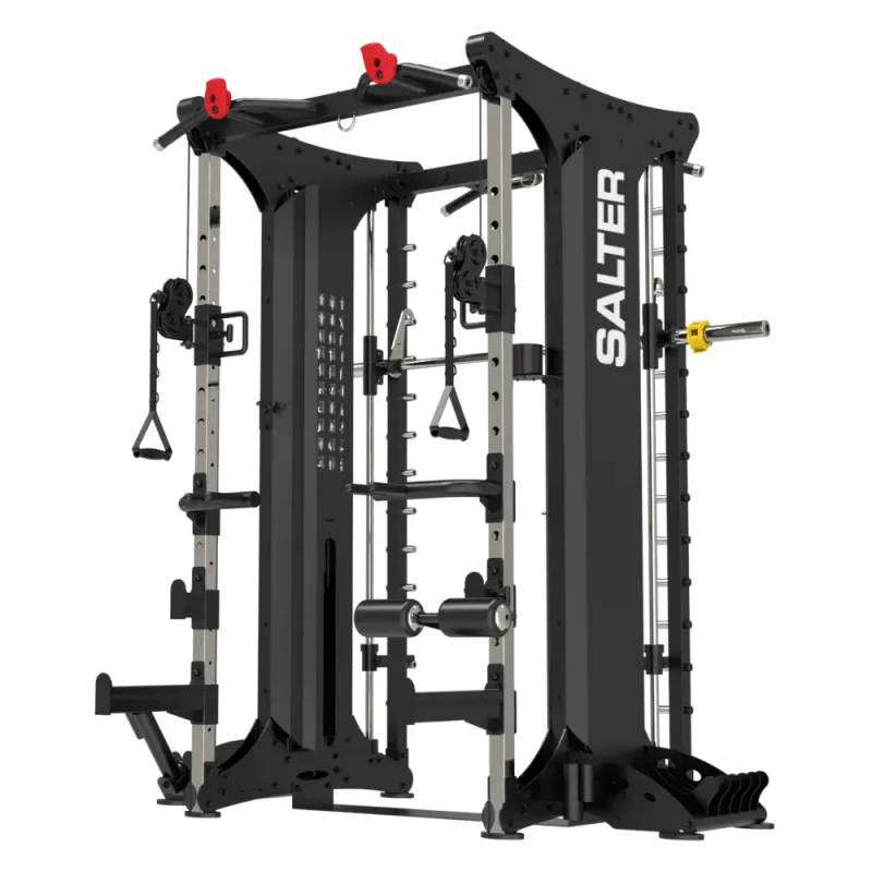 Aparat Smith Multifunctional SH-40, SalterAparat Smith Multifunctional SH-40 de la Salter este o soluție completă de antrenament de forță@ pentru a lucra toti muschii corpului, construită pentru performanță maximă și utilizare intensivă.Vă permite să efectuați peste 35 de exerciții diferite. Performanța ridicată, ușurința în utilizare și construcția robustă îl fac un echipament indispensabil pentru un antrenament de calitate, atât acasă, cât și în complexe rezidențiale, hoteluri și centre de fitness.SPECIFICATII TEHNICE:– Cadru din oțel ranforsat.– Permite utilizarea simultană de către două persoane, câte una pe fiecare parte a aparatului.– Include o gamă largă de accesorii care extind gama de exerciții.– Rulmenți liniari care oferă o mișcare lină și nu necesită întreținere.– Suport pentru discuri de greutate cu diametrul de 50 mm.– Scripeți rotative reglabile pe înălțime.– Cârlige de siguranță de 5 mm.– Bară pentru dip-uri.– Bară pentru tracțiuni.– Stâlpi verticali numerotați pentru reglarea ușoară a componentelor.– Bare de siguranță pentru bară atunci când lucrați cu greutăți libere.– Opritor de siguranță reglabil pe înălțime pe bara Multipower pentru a asigura o funcționare sigură. Ancoră pentru halteră Landmine (include atașament pentru halteră).– Suporturi pentru picioare reglabile pe înălțime.– Punct de fixare a benzii de rezistență în partea superioară.– 2 suporturi laterale pentru discuri.– Suport pentru halteră.– Sarcină de lucru: 90 kg + 90 kg.– Raport de rezistență: 2:1– Greutate: 438 kg.– Dimensiuni: 162 x 204 x 220 cm.– Utilizare intensivă.