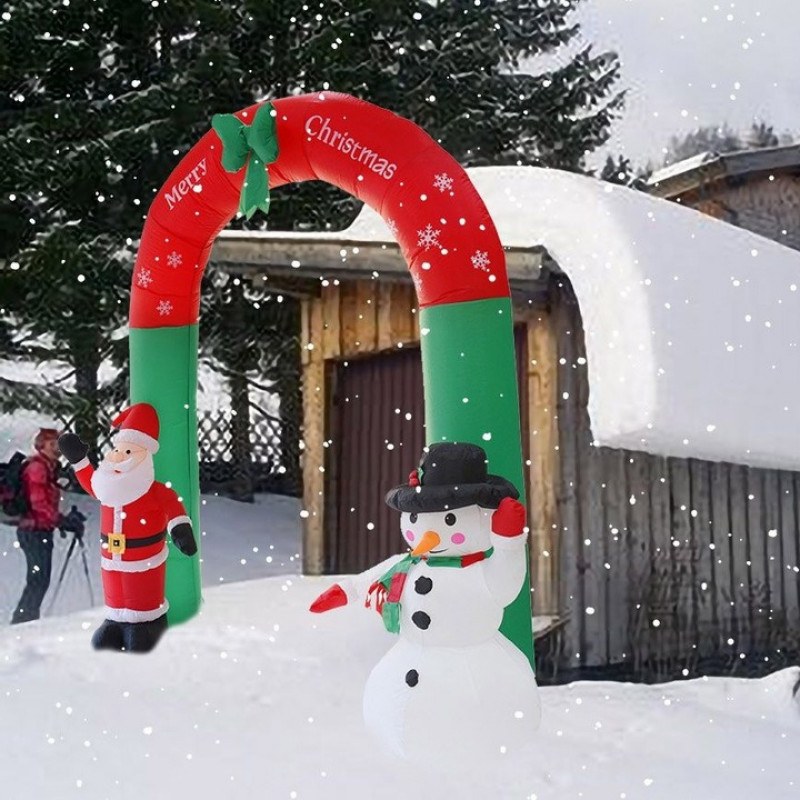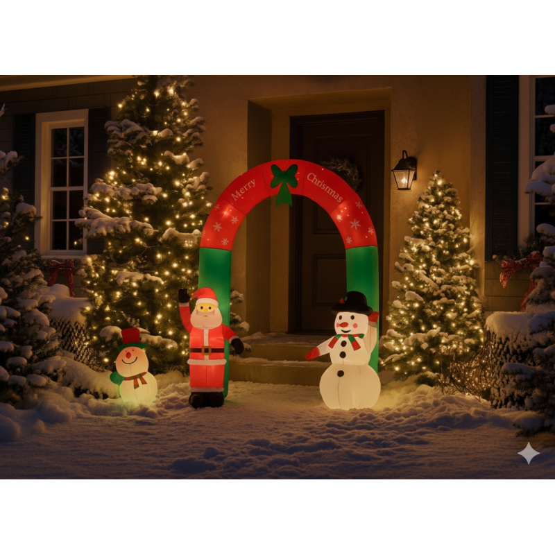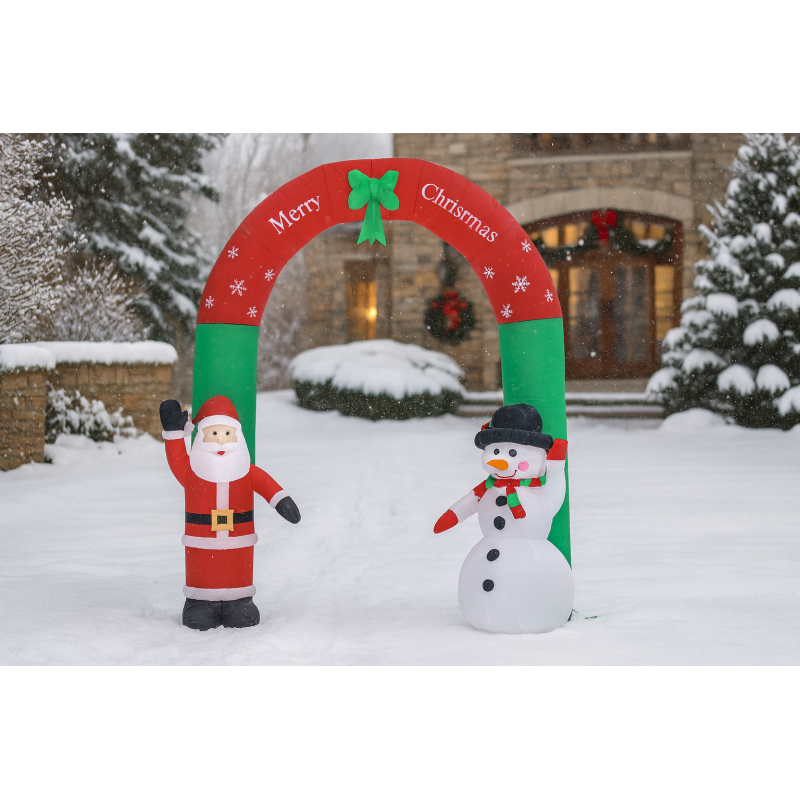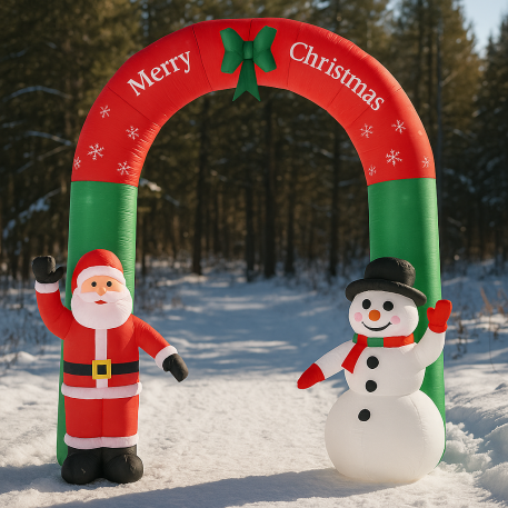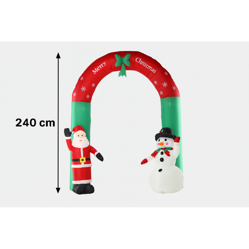 Scurta descriere Arcada gonflabila de Craciun cu Mos Craciun si Om de Zapada, iluminata cu LED, ideala pentru decorarea intrarii in casa, terasa, gradina sau spatii comerciale. Se umfla automat in aproximativ 1,5 minute si rezista la conditiile de exterior datorita protectiei IP44.