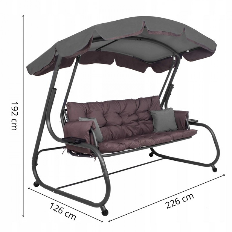 Scurta descriere Acest balansoar de gradina 3 locuri imbina confortul si functionalitatea. Echipat cu plasa anti-insecte detasabila, copertina reglabila, masute laterale si posibilitatea transformarii in pat, este alegerea perfecta pentru relaxare in aer liber. Structura robusta din otel si materialele impermeabile il fac ideal pentru gradina, terasa sau curte.
