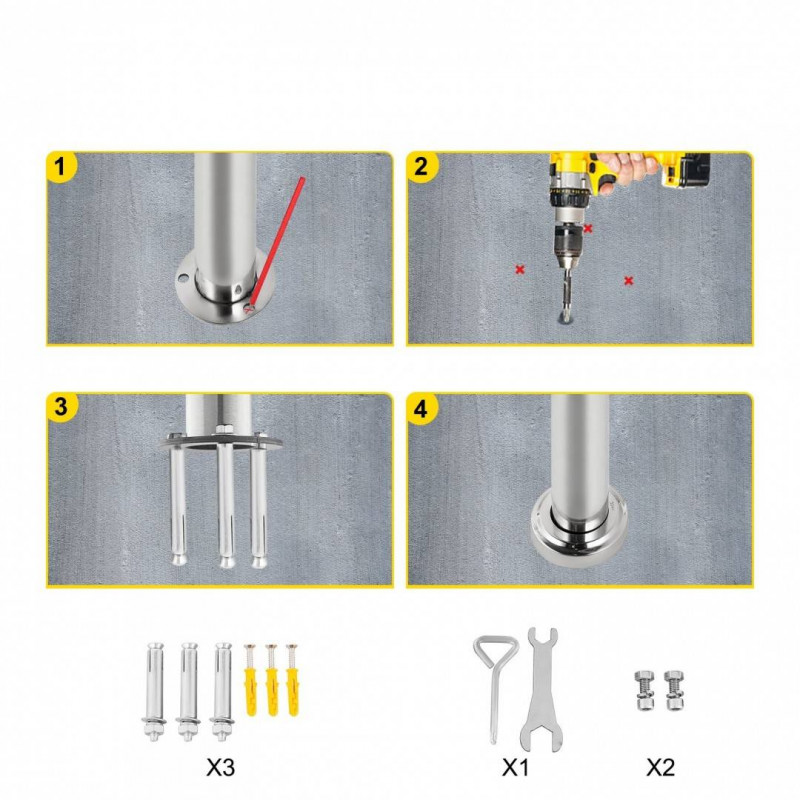 Kit de instalare pentru asamblare: Cu toate accesoriile necesare, setul de balustrada scarii poate fi asamblat fara efort de catre o persoana in cateva minute. Marcarea pozitiei dorite pe perete si podea, apoi gaurirea cu burghiu, urmeaza sa punem suruburi de expansiune si sa le fixati cu o cheie, in final, plasand garnitura de baza peste elemente de fixare.