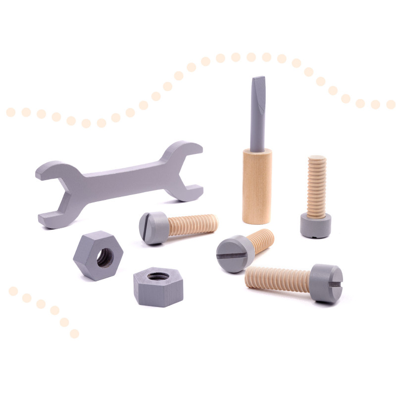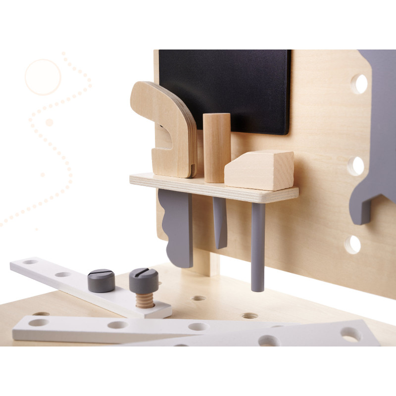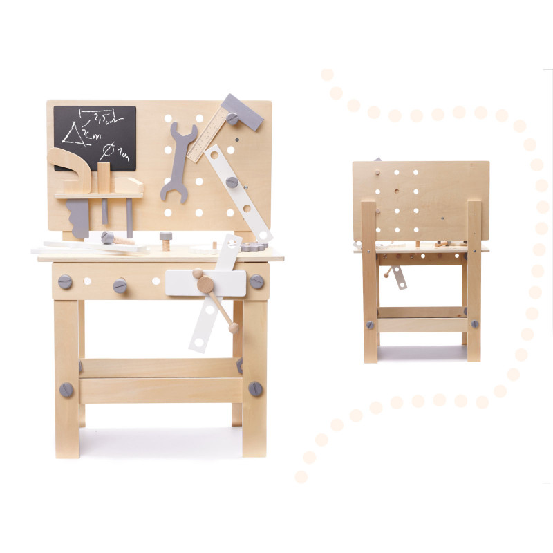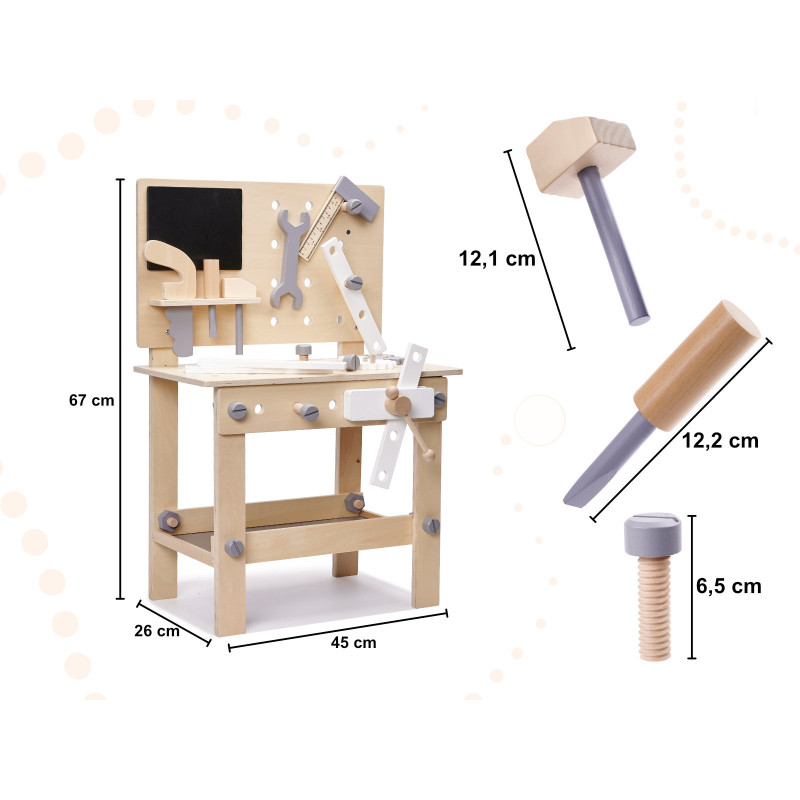 Scurta descriere Bancul de lucru din lemn cu unelte este jucaria ideala pentru copiii pasionati de constructii si reparatii. Setul contine masa solida si multiple accesorii din lemn care stimuleaza indemanarea, gandirea logica si creativitatea. Ofera ore intregi de joaca educativa si sigura, potrivita atat pentru baieti, cat si pentru fete.