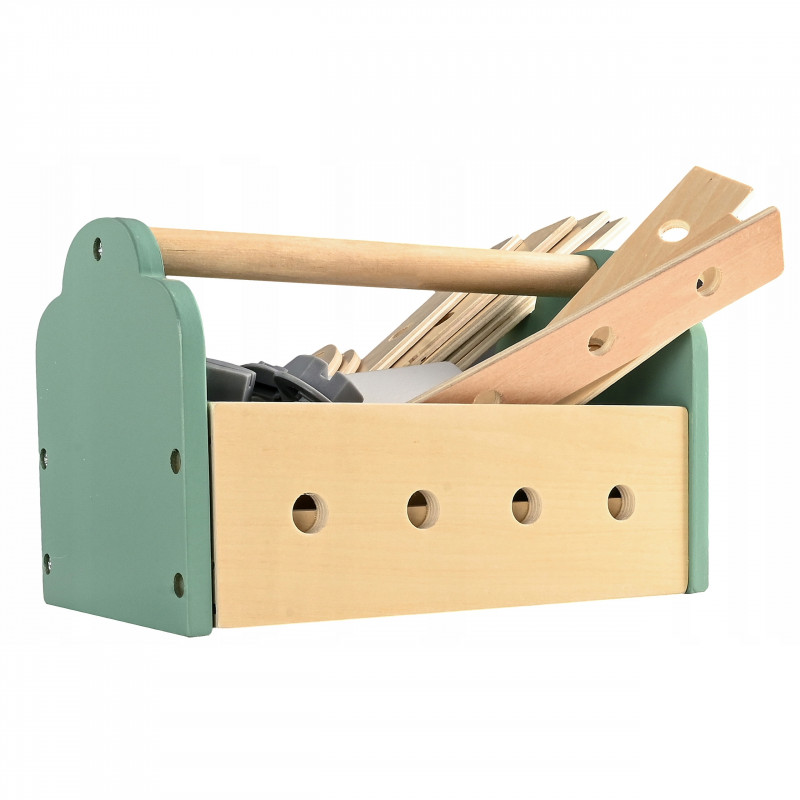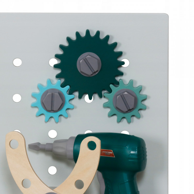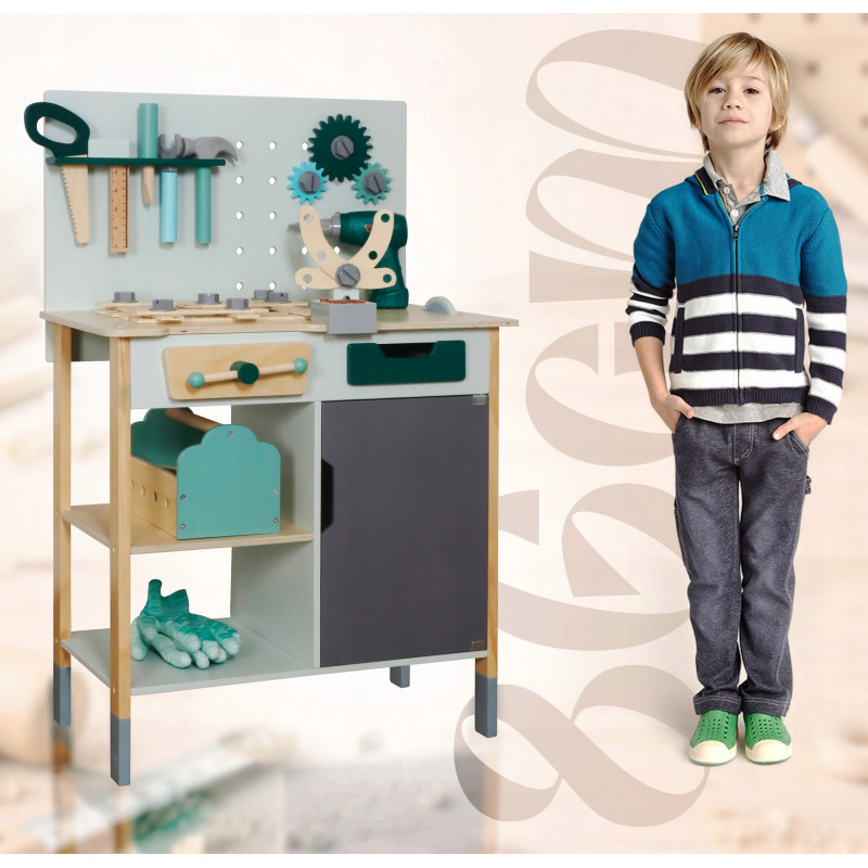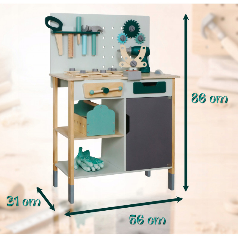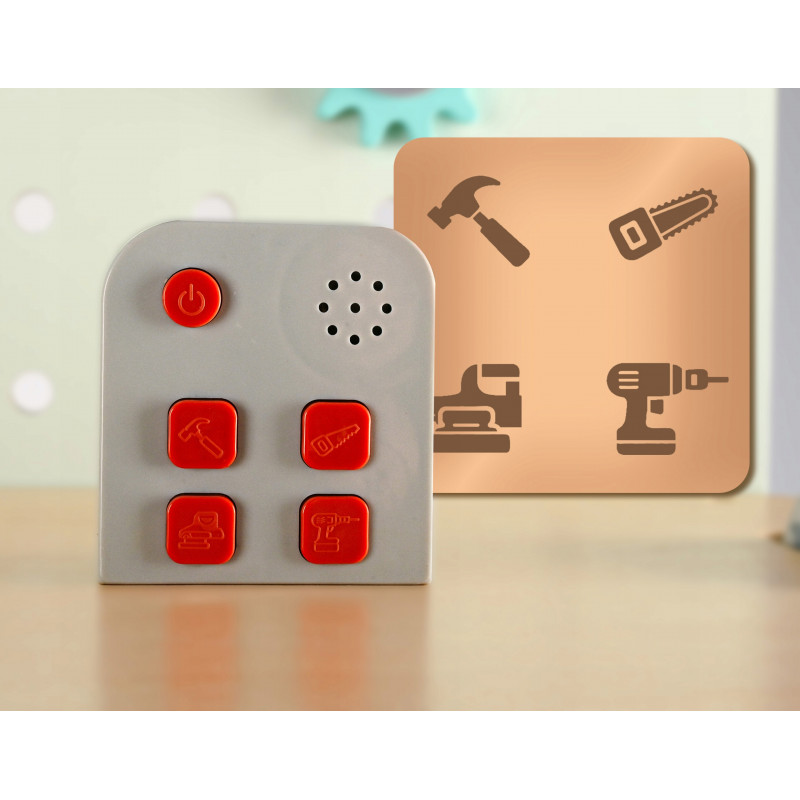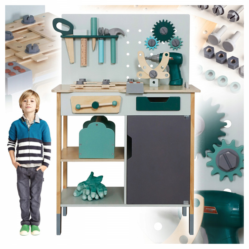 Continut pachet: banc de lucru de asamblat, fierastrau manual, dalta cu ciocan, cheie fixa, menghina, echer, cutie de unelte, fierastrau circular, bormasina electrica cu 2 capete, sertar si dulap cu deschidere, set suruburi si piulite, elemente de asamblare, modul cu sunete realiste, manusi de lucru, 5 bucati creta colorata