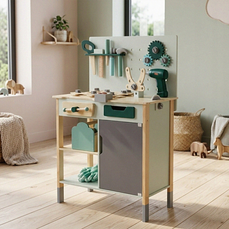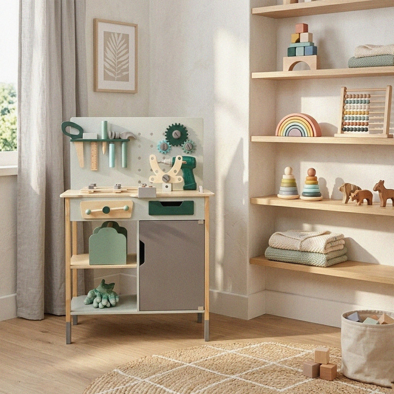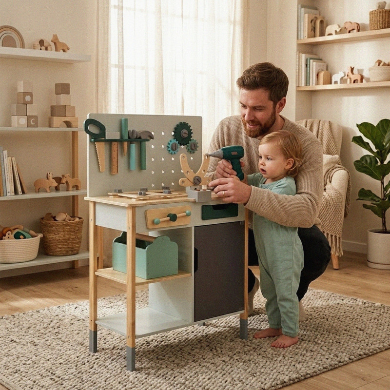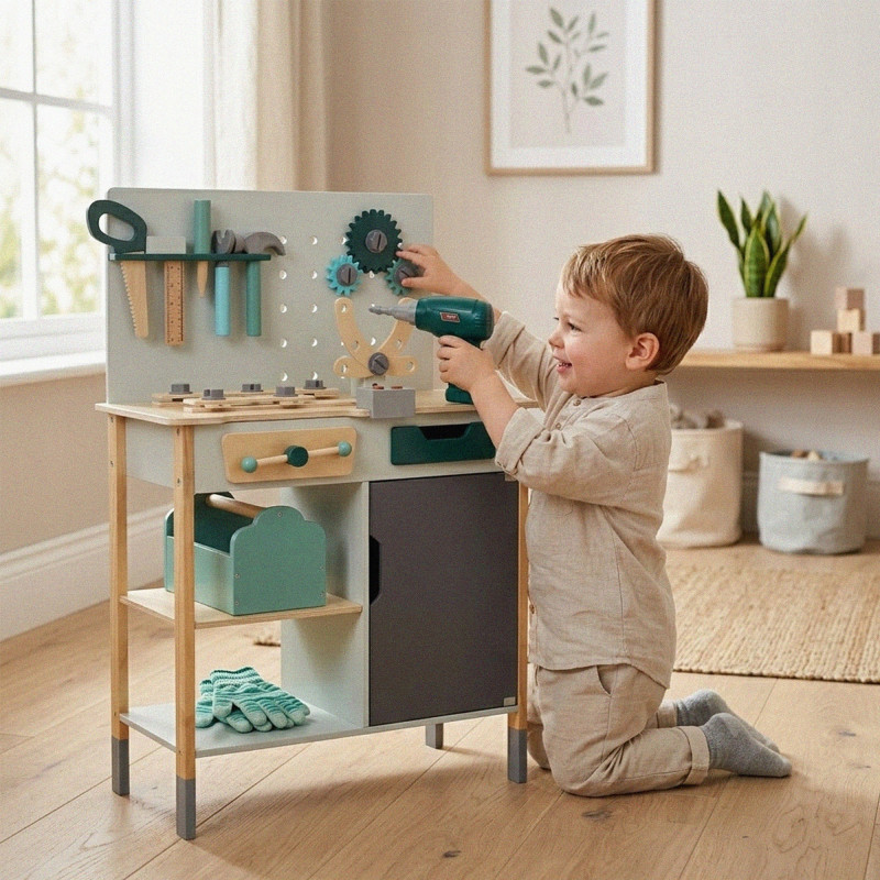 Scurta descriere Bancul de lucru din lemn pentru copii este o jucarie complexa si interactiva, perfecta pentru micii mesteri. Echipat cu blat de lucru, spatii de depozitare si numeroase unelte, permite copiilor sa creeze si sa repare in mod distractiv. Include elemente realiste, precum bormasina functionala si sunete specifice atelierului, pentru o experienta autentica de joaca. Constructia solida asigura stabilitate si utilizare indelungata, fiind ideal pentru acasa sau gradinita.
