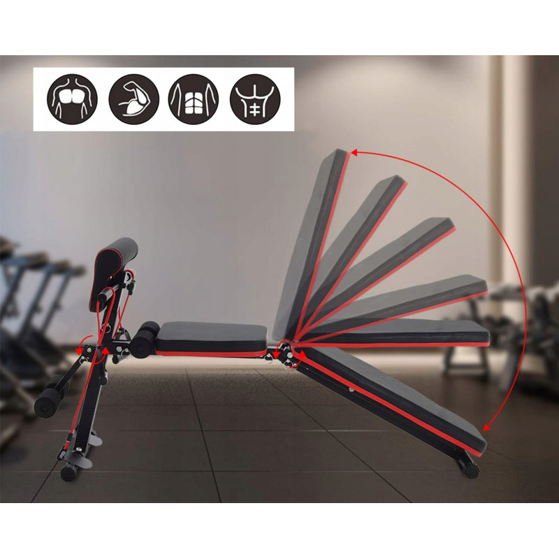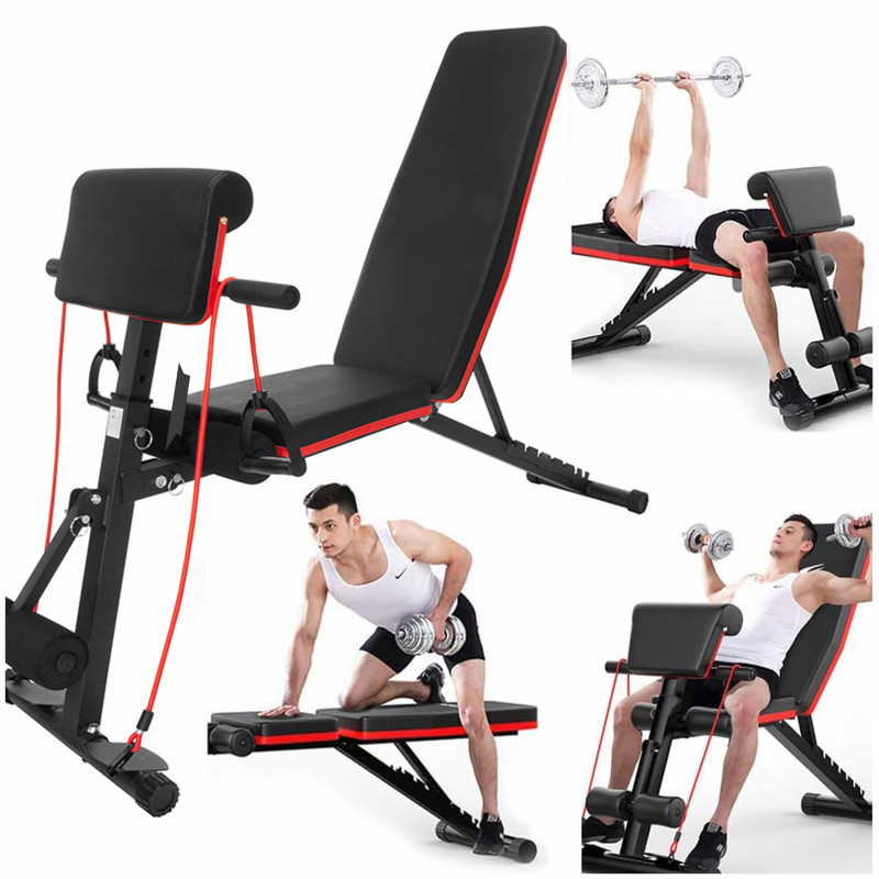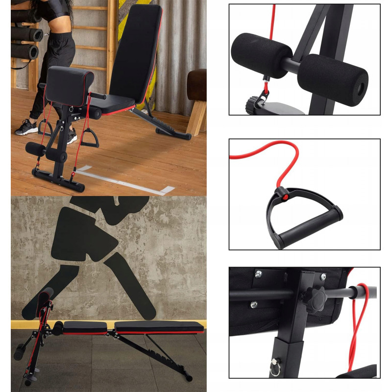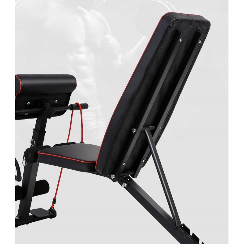 Banca de antrenament de inalta calitate, rezistenta, cu bara de rugaciune si elastice pentru exercitii. Echipamentul are o inclinare reglabila a spatarului (inclinare verticala, orizontala si negativa).