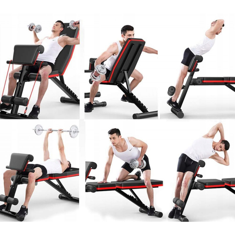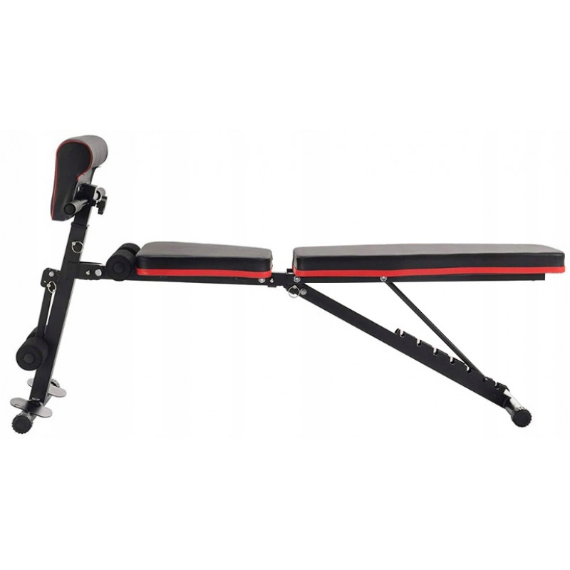 Dimensiuni generale (cu spatarul in pozitie orizontala si bara de rugaciune ridicata in pozitia cea mai inalta) 148x54x88cm Banca multifunctionala ofera o multitudine de optiuni de exercitii. Designul sau o face ideala cu un suport pentru haltere, precum si pentru antrenament cu haltere.Intervalul de reglare a unghiului spatarului va va permite sa dezvoltati pe deplin muschii exersati. Este posibil sa efectuati exercitii pentru piept si umeri. Banca este pozitionata in diagonala in jos, permitandu-va sa efectuati aplecari sau asa-numitele abdomene.Suportul pentru picioare garanteaza confortul si siguranta la efectuarea acestui exercitiu, care antreneaza muschii abdominali. Sa nu uitam ca banca este echipata cu o bara de rugaciune, care mareste gama de optiuni de exercitii, inclusiv antrenarea bicepsului.Prin indepartarea barei de rugaciune, castigam posibilitatea de a efectua antrenamentul picioarelor. Pe presa pentru picioare, putem exercita muschii cvadriceps ai coapsei.Prin asezarea bancii in pozitie orizontala, culcat pe burta si prinderea picioarelor in maner, efectuati indoiri ale picioarelor cu o sarcina, angajand astfel muschii cvadriceps ai coapsei.