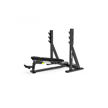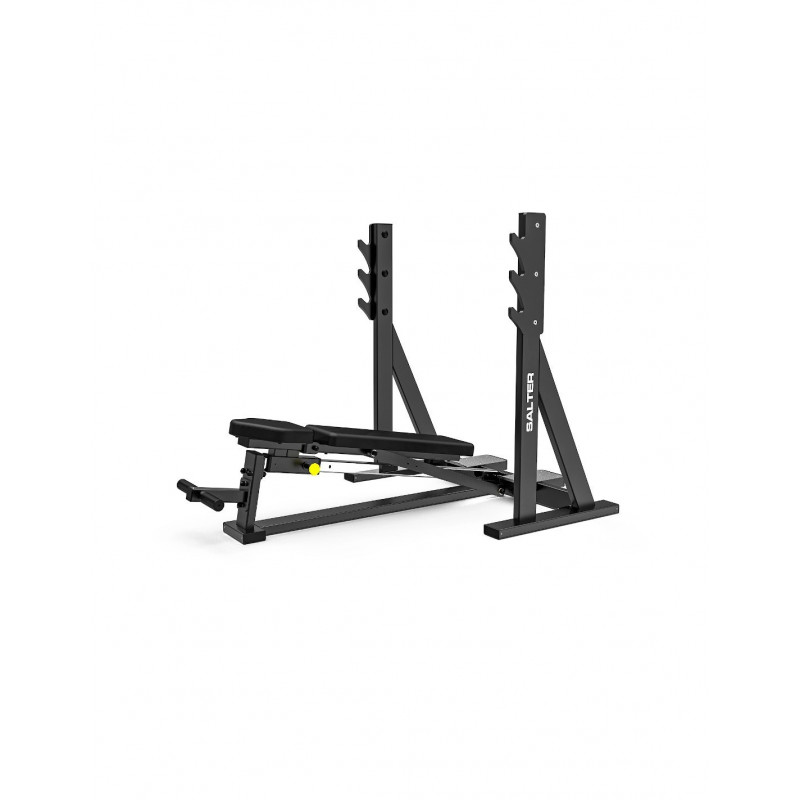 - Cadru din oțel armat de 3 mm.@- Vopsea poliesterică neagră mată de 200º.@- Tratament antioxidant.@- Tapițerie antibacteriană Norme MRSA, SANITIZATĂ,ignifugă Standard M2, UNE 1021 și absențasolvenți și substanțe nocive Standarde OEKO-TEX.@- Cusături roșii adânci.@- Spătar reglabil de la -10º la 35º care vă permite săsă lucrați în toate planurile de înclinare: presă plată, presă înclinatăpresă și presă declinată.@- Suport pentru bară cu 3 înălțimi.@- Platforme de ajutor.@- Suport pentru picioare din poliuretan.@- Dimensiuni: 182 x 128 x 135 cm- Declarație de conformitate CE.@- Utilizare comercială