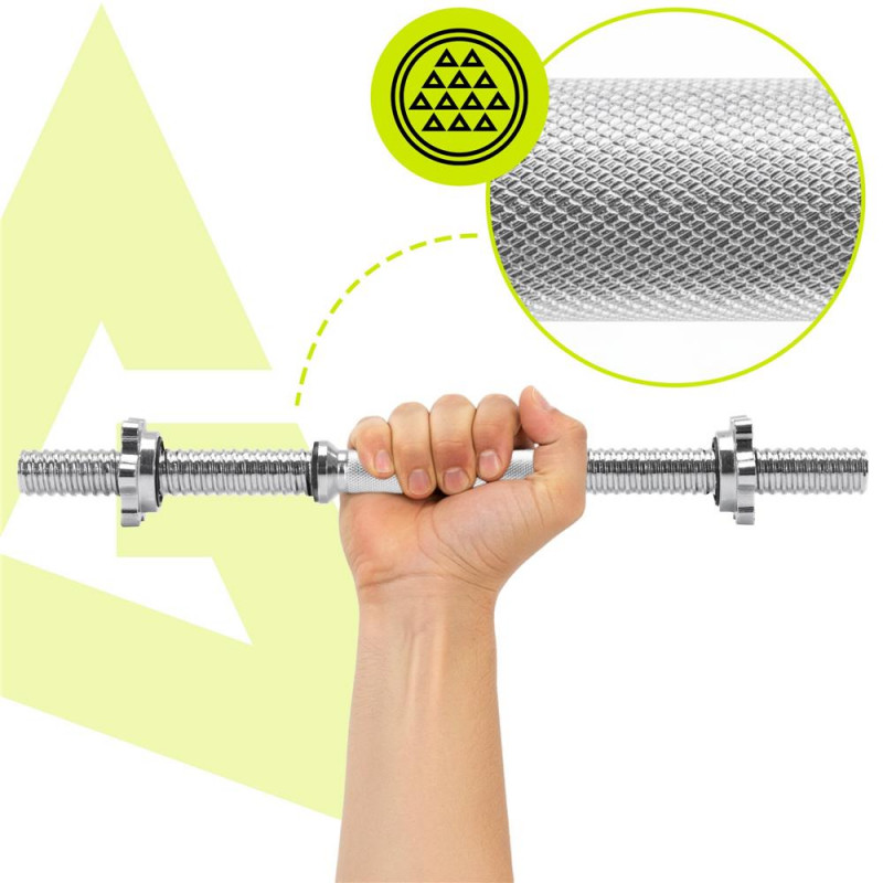 Scurta descriere: Bara scurta pentru gantera este realizata din otel cromat rezistent si este potrivita pentru antrenamente de forta acasa sau la sala. Lungimea de 48 cm si diametrul de 28 mm permit utilizarea cu discuri standard. Manerul antiderapant asigura prindere sigura in timpul exercitiilor, iar colierele filetate mentin greutatile fixate stabil pentru un antrenament eficient.