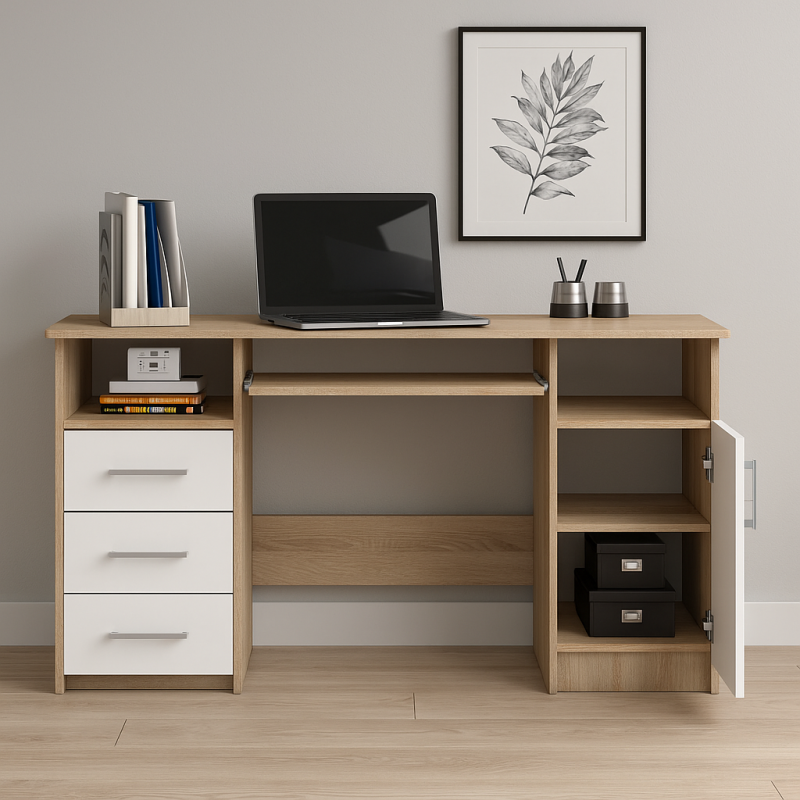 Scurta descriere Biroul ANA combina functionalitatea cu designul modern in nuante calde de stejar sonoma si alb mat. Construit din PAL laminat durabil, este ideal pentru lucrul la calculator sau pentru studiu. Dispune de 3 sertare, 1 dulap cu usa si mai multe rafturi deschise, oferind spatiu generos pentru depozitare si organizare.