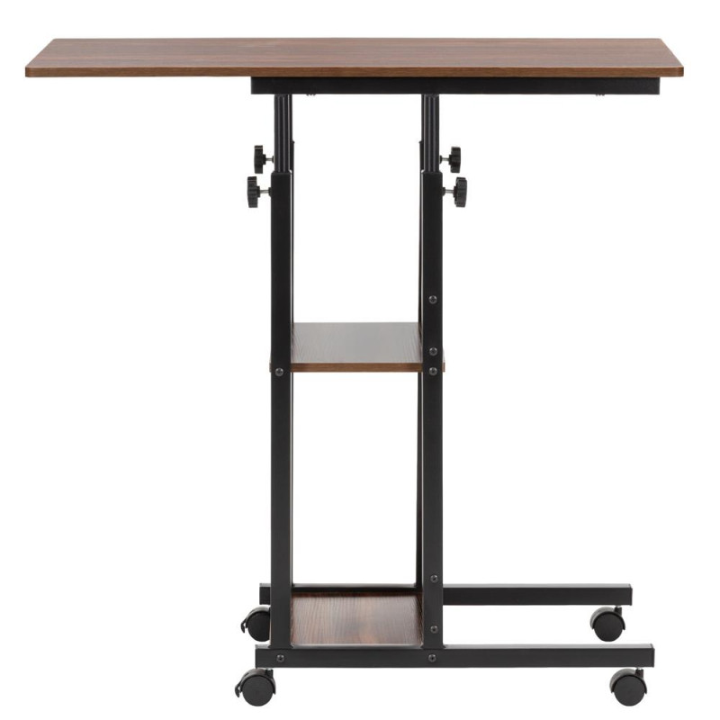 Scurta descriere: Birou compact cu inaltime reglabila manual, conceput pentru spatii de lucru flexibile. Blatul din lemn cu finisaj maro inchis este sustinut de o structura metalica stabila, iar rafturile laterale si rotile integrate ofera functionalitate si mobilitate sporita.