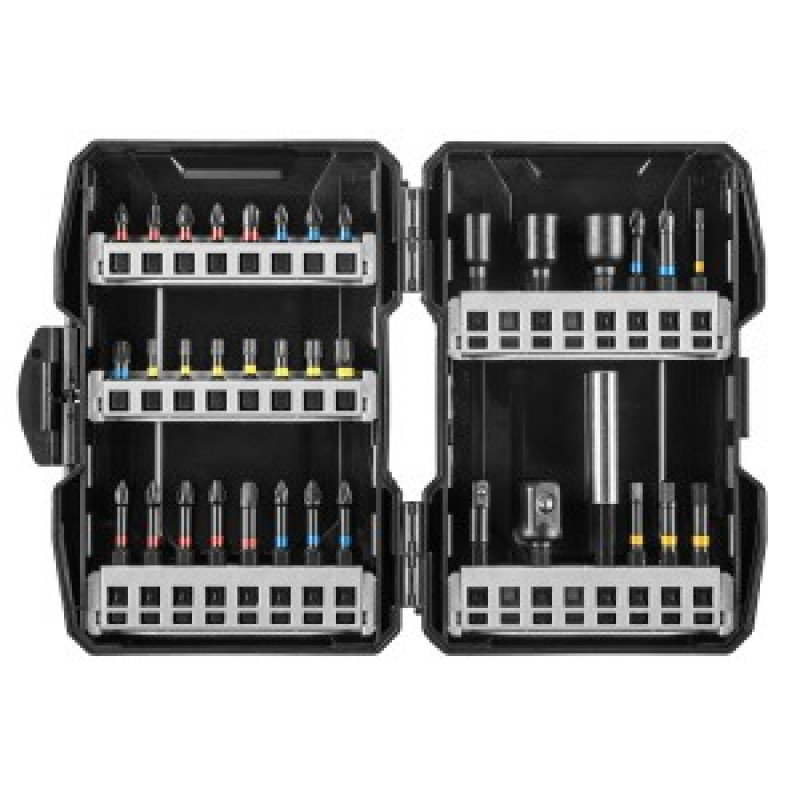 Setul de biti de impact GRAPHITE (ref. 56H560) contine 36 de articole, inclusiv 16 biti de tip PH1/2/2/2/2/3, PZ1/2/2/2/2/3, T10/15/20/25/27/30/40 cu o lungime totala de 25 mm, 14 biti de tip PH1/2/ 2/2/3, PZ1/2/2/2/2/3, HEX3/4/5/6 cu o lungime totala de 50 mm, precum si un maner, trei prize si doua adaptoare. Aceste burghie robuste sunt concepute pentru aplicatii cu cuplu mai mare de torsiune cu ajutorul surubelnitelor sau al masinilor cu impact. Fabricat din otel S2 de inalta calitate, care are o flexibilitate si o rezistenta sporita la deteriorari mecanice. Zona de torsiune, care se roteste sub un cuplu ridicat, reduce transmiterea fortei, facand ca bitul sa fie mai rezistent la rupere si prelungindu-i de cateva ori durata de viata. Varful de lucru al burghiului garanteaza o potrivire perfecta. Toate acestea sunt adapostite intr-o carcasa de plastic care poate fi inchisa, cu margini cauciucate. Marca GRAPHITE ofera o gama larga de scule electrice pentru a satisface nevoile profesionistilor.