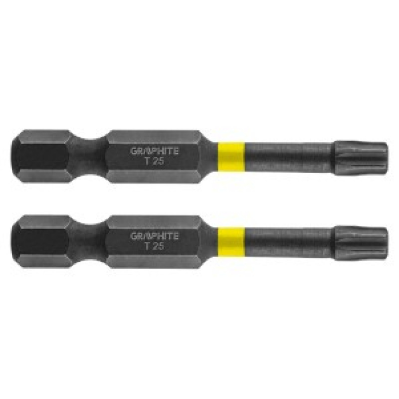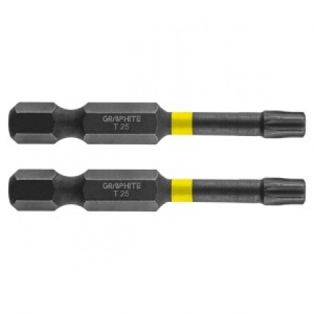 Set biti de impact GRAPHITE (Ref. 56H526) Tipul TX25, cu o lungime totala de 50 mm, este un varf robust conceput pentru lucrari cu cuplu mai mare cu surubelnite sau masini de gaurit cu impact. Fabricat din otel S2 de inalta calitate, care ofera flexibilitate si rezistenta sporita impotriva deteriorarilor mecanice. Zona de torsiune, care se roteste sub un cuplu ridicat, reduce transmiterea fortei, facand ca bitul sa fie mai rezistent la rupere si prelungindu-i de cateva ori durata de viata. Capatul de lucru al burghiului garanteaza o potrivire perfecta. Marca GRAPHITE ofera o gama larga de scule electrice pentru a satisface nevoile profesionistilor.