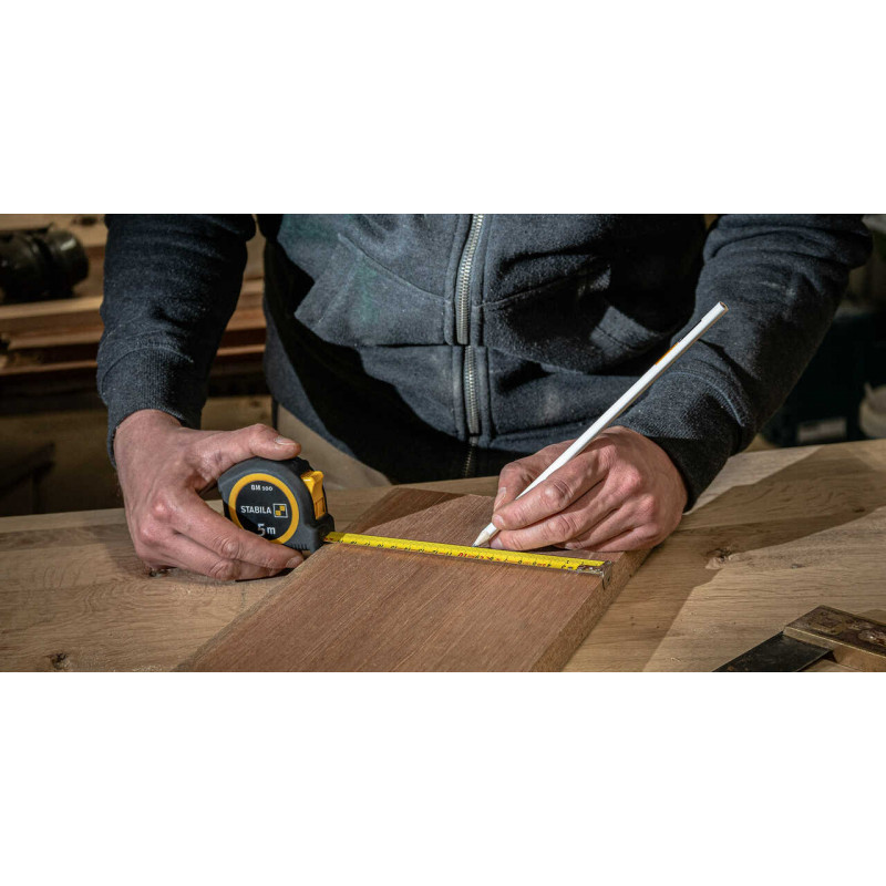Trebuie să măsurați lungimile de mai multe ori pe zi? Dacă da, această ruletă de măsurare la îndemână și fiabilă este partenerul perfect pentru munca dvs. de zi cu zi: datorită designului său compact și ușor, BM 100 sta bine în mână și vă poate însoți oriunde ați merge. Carcasa cu prindere moale face ca banda de măsurare să fie ușor de prins și oferă protecție împotriva șocurilor în caz de cădere. Scara precisă, ușor de citit, facilitează marcarea. Caracteristicile ruletei, care este concepută pentru șantierele de construcții, sunt completate cu o frână puternică și o retragere puternică a lamei.