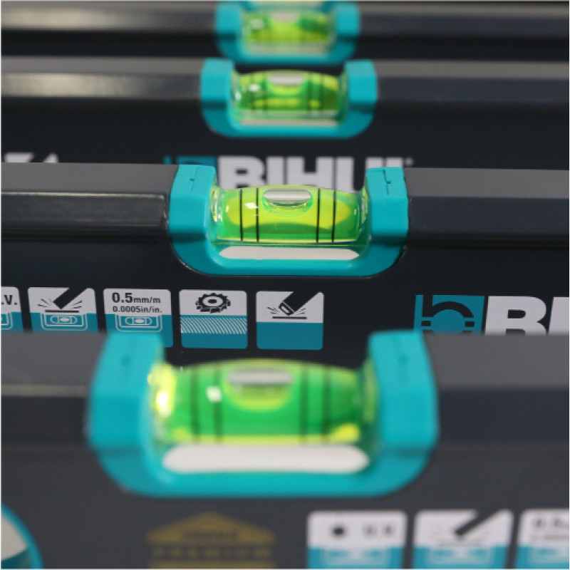 Nivelele cu bula BIHUI sunt realizate din profile de aluminiu dreptunghiulare, ușoare, durabile. Partea inferioară a nivelelor suferă un tratament special pentru a obține o suprafață perfect plană.