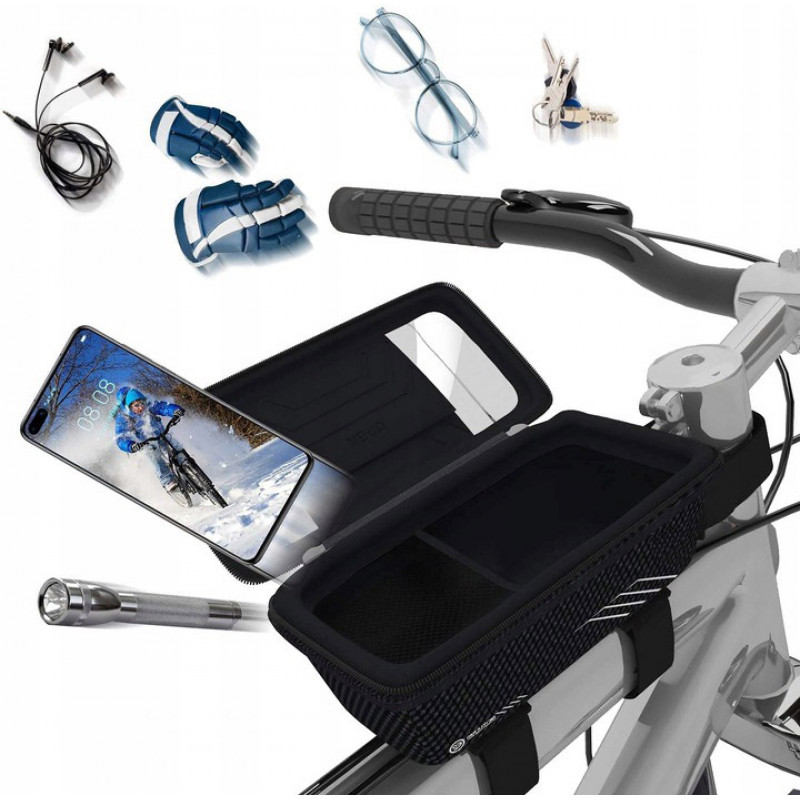 Dimensiuni exterioare: lungime/latime/inaltime: 19,5x11x9 cm Geanta de bicicleta va permite sa va depozitati toate lucrurile esentiale intr-un singur loc! Dotata cu un buzunar special pentru smartphone, aceasta va contine obiecte importante, precum chei, documente si bani. Buzunarul transparent pentru telefon este ideal pentru navigatia pe drum!