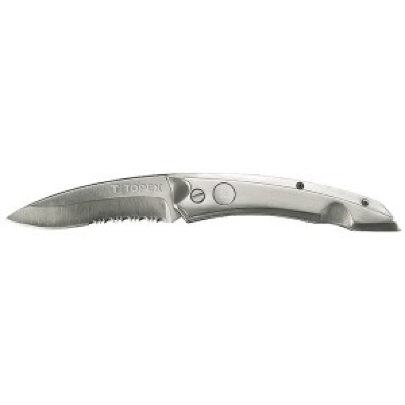 Cutit universal TOPEX, cu lungimea lamei de 80 mm. Lama este realizata din otel inoxidabil de inalta calitate, care asigura viata lunga instrumentului. Munca sub sarcina grea este posibila datorita corpului metalic, solid. Mecanismul de pliere a lamei imbunatateste activitatea de lucru cu instrumentul. Opritorul lamei ofera securitate in timpul utilizarii. Un alt avantaj este clema pentru curea, astfel incat cutitul poate fi intotdeauna la indemana. Posibilitatea de a depozita si transporta usor. Marca TOPEX se adreseaza mesterilor.