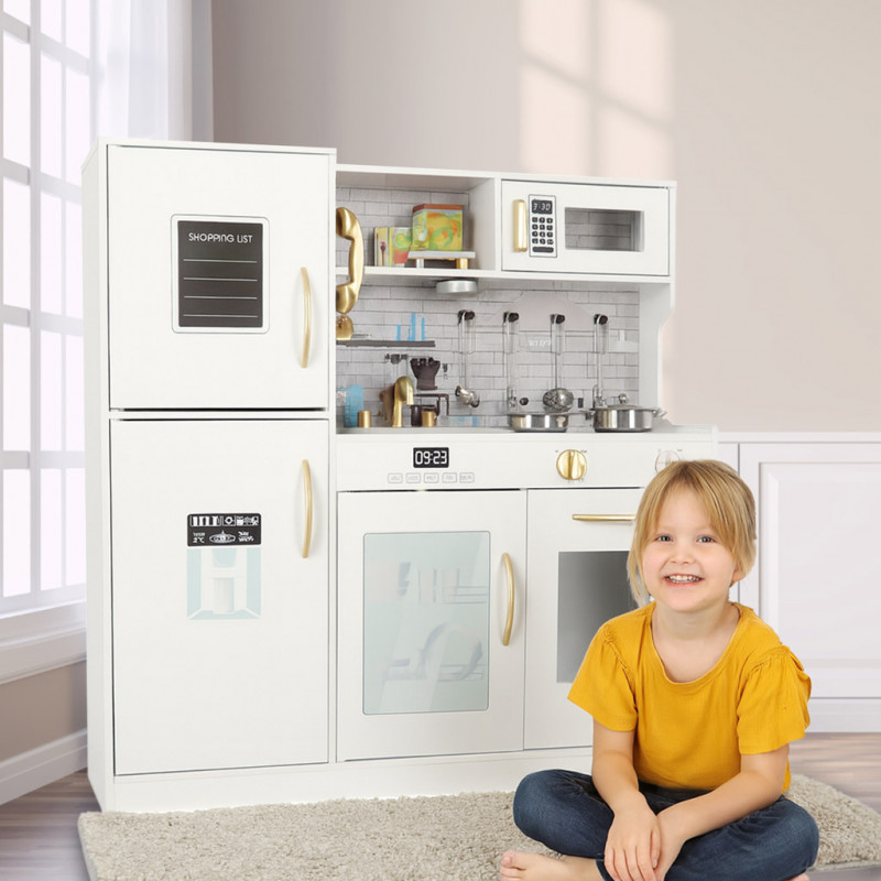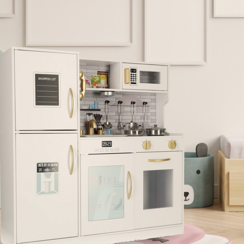 Scurta descriere Bucataria din lemn pentru copii este un joc educational creat pentru a stimula imaginatia si abilitatile practice ale celor mici. Realizata din lemn solid, cu finisaje fine si grafica realista, include frigider, aragaz, cuptor, masina de spalat vase si alte electrocasnice desenate. Setul contine si accesorii din metal – oala, tigaie si ustensile – pentru o experienta cat mai reala de gatit.