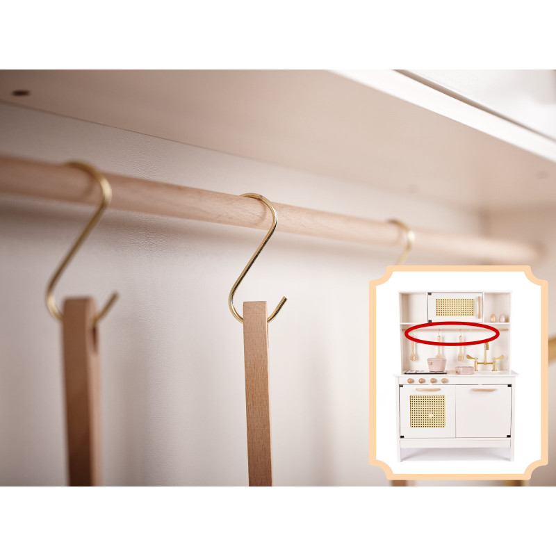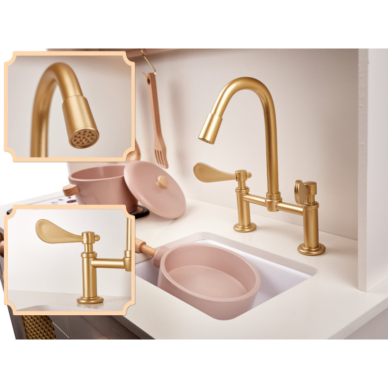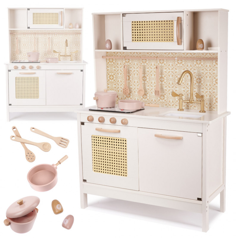 Include multiple accesorii: ustensile, oale, solnita, rafturi Chiuveta adanca cu robinet si butoane rotative Design retro-boho in culori neutre, usor de integrat in decor Stimuleaza imaginatia, coordonarea si motricitatea fina