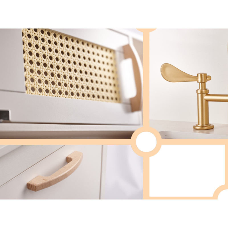 Scurta descriere: Aceasta bucatarie din lemn pentru copii ii invita pe cei mici intr-un joc de rol captivant, plin de imaginatie si miscare. Echipata cu chiuveta, plita cu efecte luminoase si sonore, cuptor decorat cu plasa ratan, ustensile din lemn si rafturi pentru depozitare, aceasta bucatarie este un spatiu complet de joaca. Designul boho, in culori calde si linii simple, se potriveste perfect in orice camera de copil.