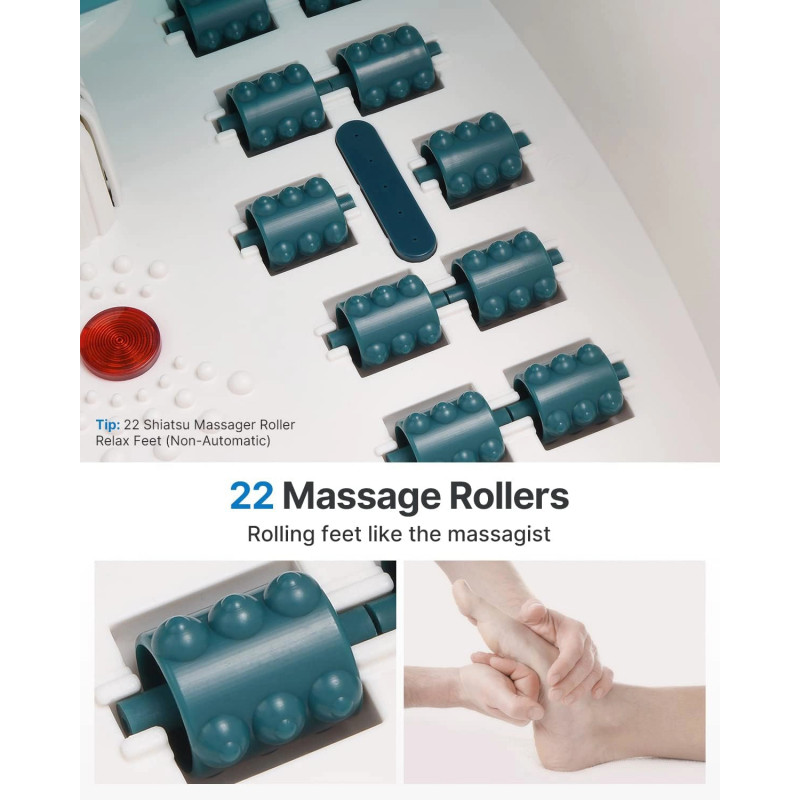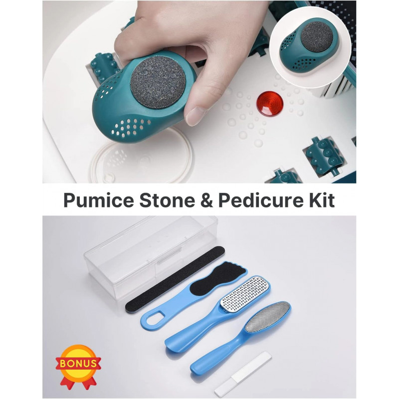 Aparatul include un set de pedichiură format din 5 piese, piatră pentru călcâie și 22 de role de masaj, care ajută la îndepărtarea bătăturilor și a pielii moarte. În plus, este prevăzut cu un compartiment special pentru săruri de baie pentru picioare, pentru un efect de relaxare sporit.
