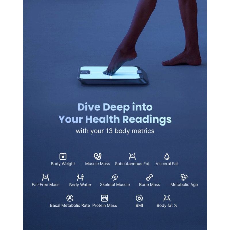 Cântarul nostru inteligent oferă o gamă extinsă de măsurători, inclusiv greutatea corporală, IMC, procentul de grăsime corporală, masa musculară, grăsimea subcutanată, greutatea corporală fără grăsime, grăsimea viscerală, apa corporală, masa osoasă, proteinele și vârsta metabolică.