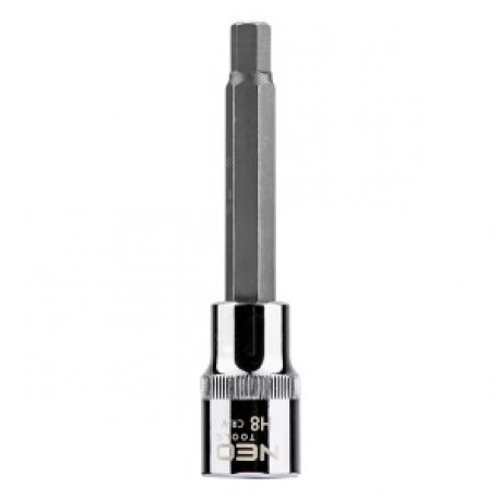 Tubulara cu Bit profil hexagonal lung 1/2", H8 X 100 mm Neo (ref. 08-783) dimensiune H8, lungime 100 mm, in conformitate cu DIN 7422.tubulara este fabricat din otel crom vanadiu durabil. Capatul hexagonal din otel aliat S2 de inalta calitate. Calitatea uneltelor este confirmata de certificatul TÜV si de garantia de 25 de ani a producatorului. Marca Neo raspunde asteptarilor profesionistilor.
