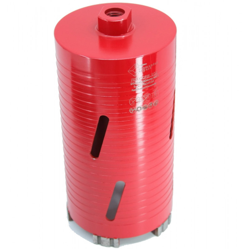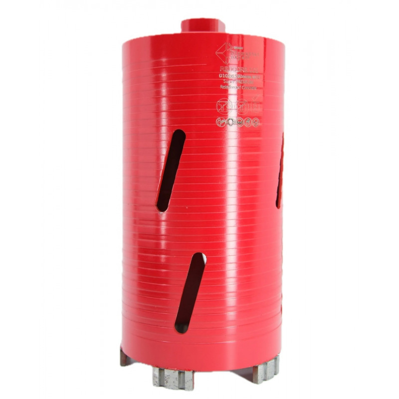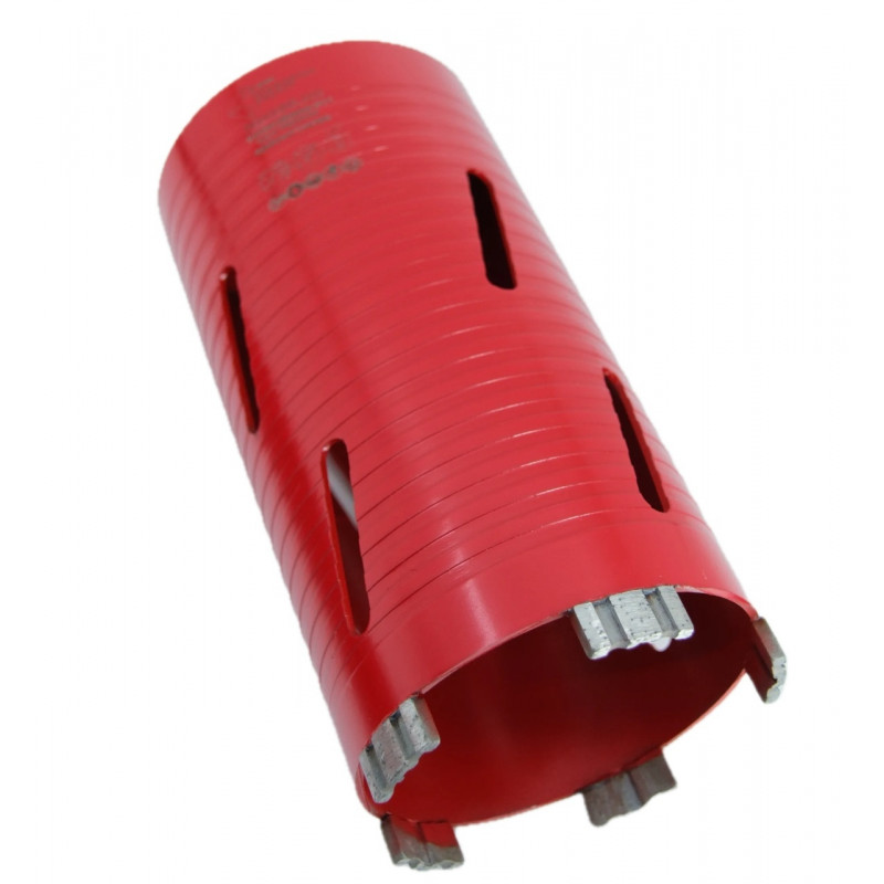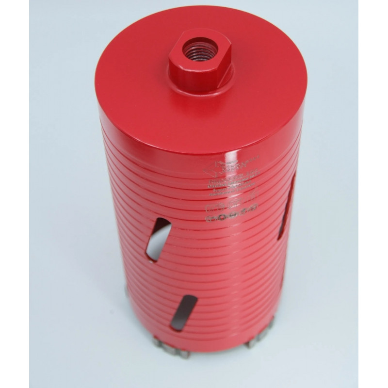 Carota diamantată Super PREMIUM un design robust, cu segmenti mari de tip Turbo, care asigură o viteză mare de tăiere și o evacuare eficientă a șlamului și prafului. Segmenti diamantati de înaltă calitate garantează o durabilitate excepțională și eficiență, în special în materiale dure precum betonul armat, granitul și marmura.