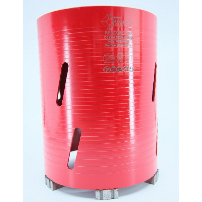 Carota diamantată Super PREMIUM un design robust, cu segmenti mari de tip Turbo, care asigură o viteză mare de tăiere și o evacuare eficientă a șlamului și prafului. Segmenti diamantati de înaltă calitate garantează o durabilitate excepțională și eficiență, în special în materiale dure precum betonul armat, granitul și marmura.