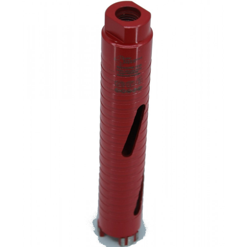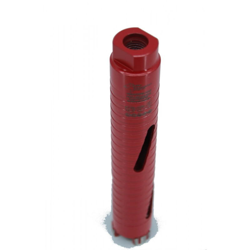 Carota diamantată Super PREMIUM un design robust, cu segmenti mari de tip Turbo, care asigură o viteză mare de tăiere și o evacuare eficientă a șlamului și prafului. Segmenti diamantati de înaltă calitate garantează o durabilitate excepțională și eficiență, în special în materiale dure precum betonul armat, granitul și marmura.