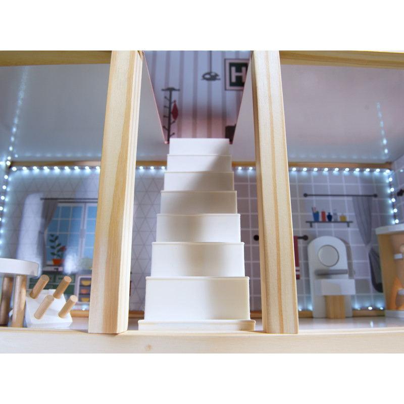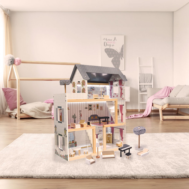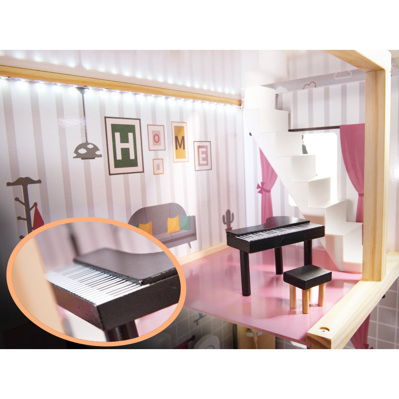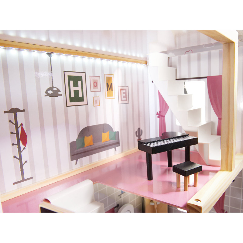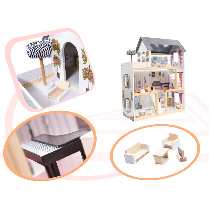 Scurta descriere Casa de papusi din lemn cu 3 etaje este o jucarie spectaculoasa pentru copii, cu 4 camere complet mobilate si terasa spatioasa. Grafica colorata si banda LED aduc realism si modernitate. Include mobilier din lemn in miniatura si accesorii pentru ore intregi de joaca creativa.